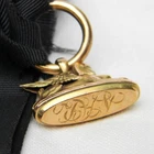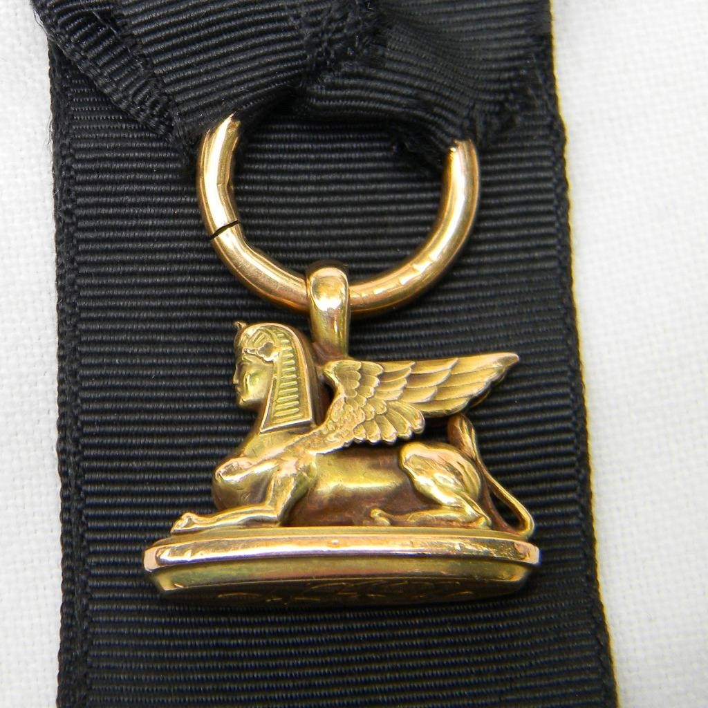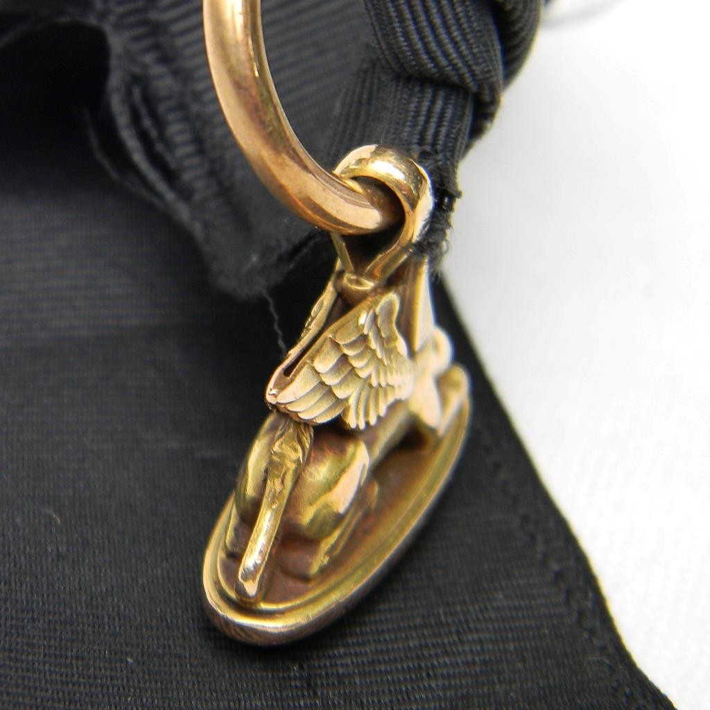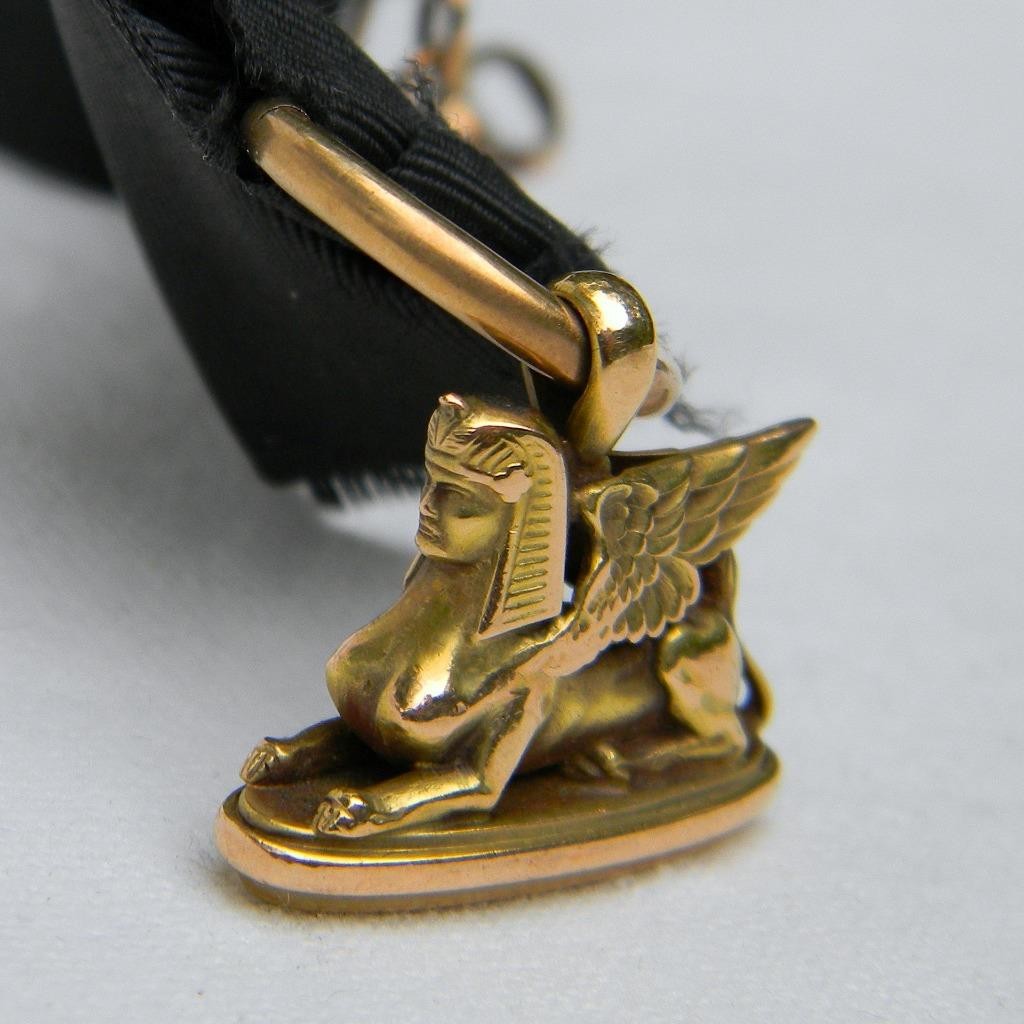 Rare late 19th century Egyptian Revival style solid rose gold pendant/personal seal fob on original gold chain/silk ribbon suspension. This Egyptian Revival type was inspired by the cultural fascination with ancient Egypt in the 19th century. A finely detailed sitting sphinx on a hand-engraved “pedestal” with a neoclassical style monogram N A R. The entire set is about 11.9 grams total; the sphinx is about 24.14 mm long at the base, 8.8 mm wide, 21.53 mm tall from the base to the loop's top. The ring is about 18.2 mm. The sphinx rose gold piece is unmarked; tested 14K. Yellow gold suspension chain is marked 14K on the latch. Original black silk ribbon is fair with some fraying on the edges. Not a later reproduction or a copy; it is guaranteed to be 100% genuine or your money back. Victorian 14K rose gold sphinx pendant/fob on gold chain/silk ribbon; 11.9 grams Victorian 14K rose gold sphinx pendant/fob on gold chain/silk ribbon; 11.9 grams Click images to enlarge Description Rare late 19th century Victorian-era Egyptian Revival solid rose gold watch fob pendant on original gold chain-and-silk ribbon suspension. This “Egyptian Revival” type was inspired by the cultural fascination with ancient Egypt that swept through Europe after the discovery of the Rosetta Stone and subsequent archaeological explorations in Egypt. This rare gold piece features a finely detailed sitting sphinx on a flat “pedestal” that was hand-engraved with the owner’s initials N A R forming an artistic neoclassical style monogram, typical of the high Victorian aesthetics. A sphinx is the symbol of strength, wisdom, and mystery; the piece is exquisitely sculpted with period-authentic craftsmanship. The entire set is about 11.9 grams total; the sphinx is about 24.14 mm long at the base, 8.8 mm wide at the base, 21.53 mm tall from the base to the top of the ring loop. The ring is about 18.2 mm in diameter. The sphinx rose gold piece is unmarked; tested 14K. Yellow ghold top suspension chain is marked 14K on the latch. Original black silk ribbon is in fair condition with some fraying on the edges. This rare original Victorian era gold sphinx pendant/fob is not a later reproduction or a copy; it is guaranteed to be 100% genuine or your money back. Not cleaned; these are the actual photos. FREE SECURE SHIPPING VIA REGISTERED MAIL within the US for this item. Secure sign-for USPS Registered Mail delivery for international buyers will be $48 and up to most countries on our "ship-to" list. EFFECTIVE IMMEDIATELY WE NO LONGER SELL AND/OR SHIP TO RUSSIA, NO EXCEPTIONS! Payment Payment is required within 5 days from the day of the purchase; irresponsible buyers will be reported to eBay. We reserve the right to cancel purchases and/or decline payments from buyers with "0" or high-negative feedback rating. EFFECTIVE IMMEDIATELY WE NO LONGER ACCEPT PAYMENTS FROM OR SELL/SHIP TO RUSSIA, NO EXCEPTIONS. Shipping We usually ship within 1 business day of receiving CLEARED payment. On-line tracking information for shipments within the US will be provided for all purchases over $10. When we can, we will combine S&H fees for most items purchased on the same day. International purchases over $120 will require delivery via secure Registered Mail ($44 to most countries). Shipping of silver and gold coins to Israel will require delivery via secure Registered Mail ($44 to Israel). All international buyers will be responsible for any applicable customs fees, duties, import taxes, etc. Due to consistent problems with customs/local postal services and rampant mail theft we DO NOT SHIP to the following countries: Afghanistan, Albania, Algeria, Angola, Azerbaijan, Bangladesh, Belarus, Benin, Botswana, Brunei, Burkina Faso, Burundi, Cambodia, Cameroon, Cape Verde Islands, Central African Republic, Chad, China, Comoros, Congo (Democratic Republic), Darussalam, Djibouti, Equatorial Guinea, Egypt, Eritrea, Ethiopia, Gabon Republic, Gambia, Ghana, Guinea, Guinea-Bissau, Haiti, Indonesia, Iran, Iraq, Ivory Coast (Côte d'Ivoire), Kenya, Kyrgyzstan, Laos, Lebanon, Lesotho, Liberia, Libya, Macau, Madagascar, Malawi, Malaysia, Maldives, Mali, Mauritania, Mauritius, Mayotte, Moldova, Mongolia, Morocco, Mozambique, Namibia, Nepal, Niger, Nigeria, Pakistan, Republic of Congo, Reunion Island, russia and russia-occupied territories, Rwanda, Saint Helena, Senegal, Seychelles, Sierra Leone, Somalia, Sri Lanka, Sudan, Suriname, Swaziland, Syria, Tajikistan, Tanzania, Togo, Tunisia, Turkmenistan, Uganda, Uruguay, Uzbekistan, Venezuela, Vietnam, Western Sahara, Yemen, Zaire, Zambia and Zimbabwe. Shipping and handling fees are not negotiable. Terms of Sale Payment is required within 5 calendar days from the end of the auction. Positive feedback will be returned when you post yours as only a portion of all buyers ever bothers to leave any feedback at all. WE WILL ACCEPT RETURNS ON GRADED COINS AND BANKNOTES ONLY IF AN ITEM WAS NOT AS DESCRIBED AS THE AUTHENTICITY AND GRADE ARE GUARANTEED BY THE GRADING SERVICE. For all other items we have an easy no-hassle return policy: we will refund your purchase if the item is returned within 30 days. Buyer must pay shipping expenses and notify us prior to return. All returned items must be in the same "as purchased" condition as they were shipped to you, including original mint packaging/enclosed COA (if applicable). No returns will be accepted 30 days after purchase, or if you damage, clean, polish, or otherwise alter the item and/or if you damage/loose original mint packaging/enclosed COA (if applicable). EFFECTIVE IMMEDIATELY, WE NO LONGER SELL AND/OR SHIP TO RUSSIA, NO EXCEPTIONS ! About Us We have been selling and buying on eBay since 1999. We always treat our customers with professionalism and respect. We are looking forward to having business with you; you will not be disappointed. Contact Us Please email us BEFORE bidding if you have questions about this item, payment options, shipping terms, etc. Extra photogra