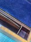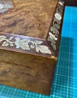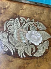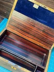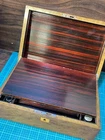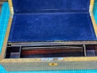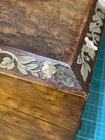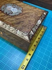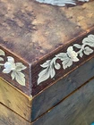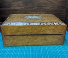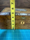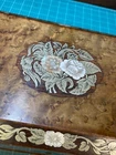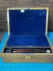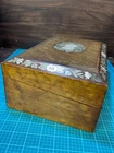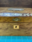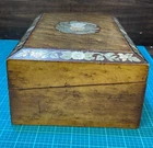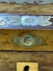 Victorian lacquered mother of pearl inlaid travel writing desk. Tag on front is monogrammed and name is also on bottom of the box. Has a few flaws but in overall very nice antique condition. One of the inkwells is missing the top. Beautiful travel desk. Please note that photos are part of description and message with any questions prior to purchase as returns are not accepted. Thank you.
