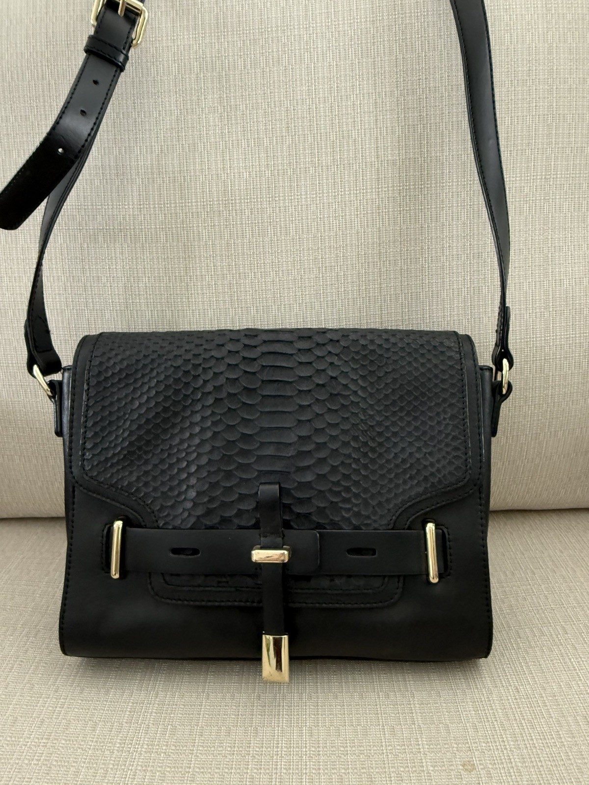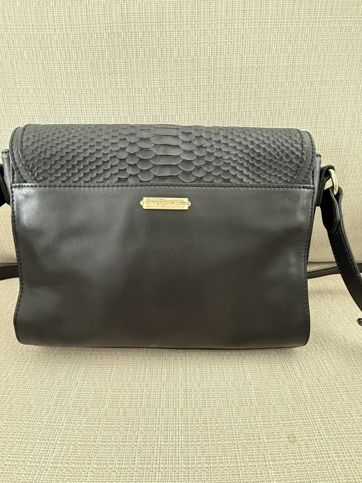 Bag is 9.5” long, 7” high and 1.75” deep Adjustable crossbody strap Full length pocket in the back with magnetic snap closure Interior futures one zip pocket and two slip in pockets In good useful condition with minor unnoticeable signs of wear Missing bag charm