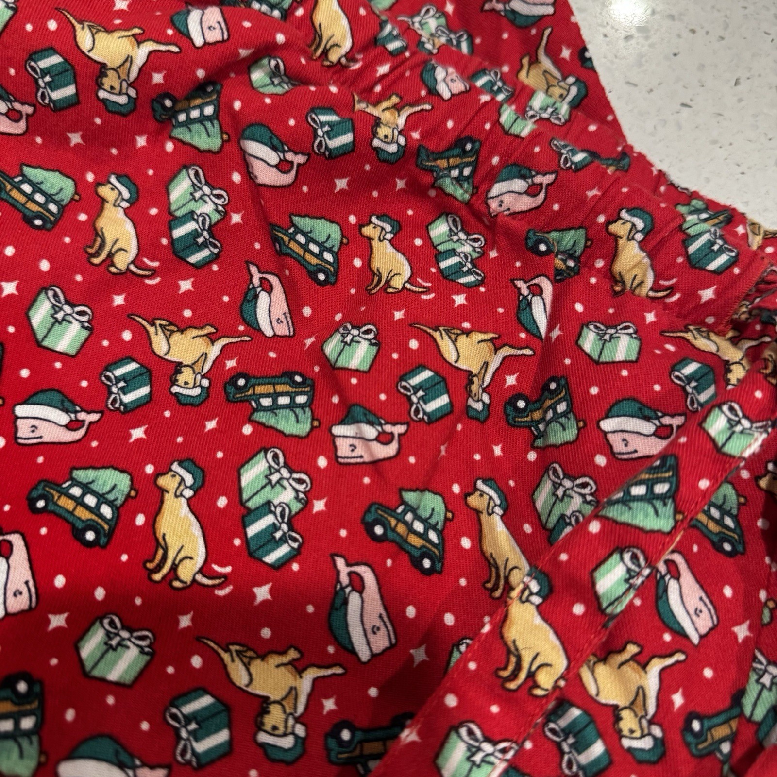 These super soft 100% cotton pajama pants feature a bright red background covered in the brand’s iconic holiday motifs — Santa whale, yellow labs, gifts, snow, and classic Vineyard Vines car graphics. - Like new condition - Keywords: holiday print, Christmas pajamas, festive lounge pants, cottagecore cozy, winter loungewear, whimsical print, Christmas morning, family matching pajamas, soft cotton pants, novelty print, red holiday pants, preppy holiday style, cozycore, gift season vibes