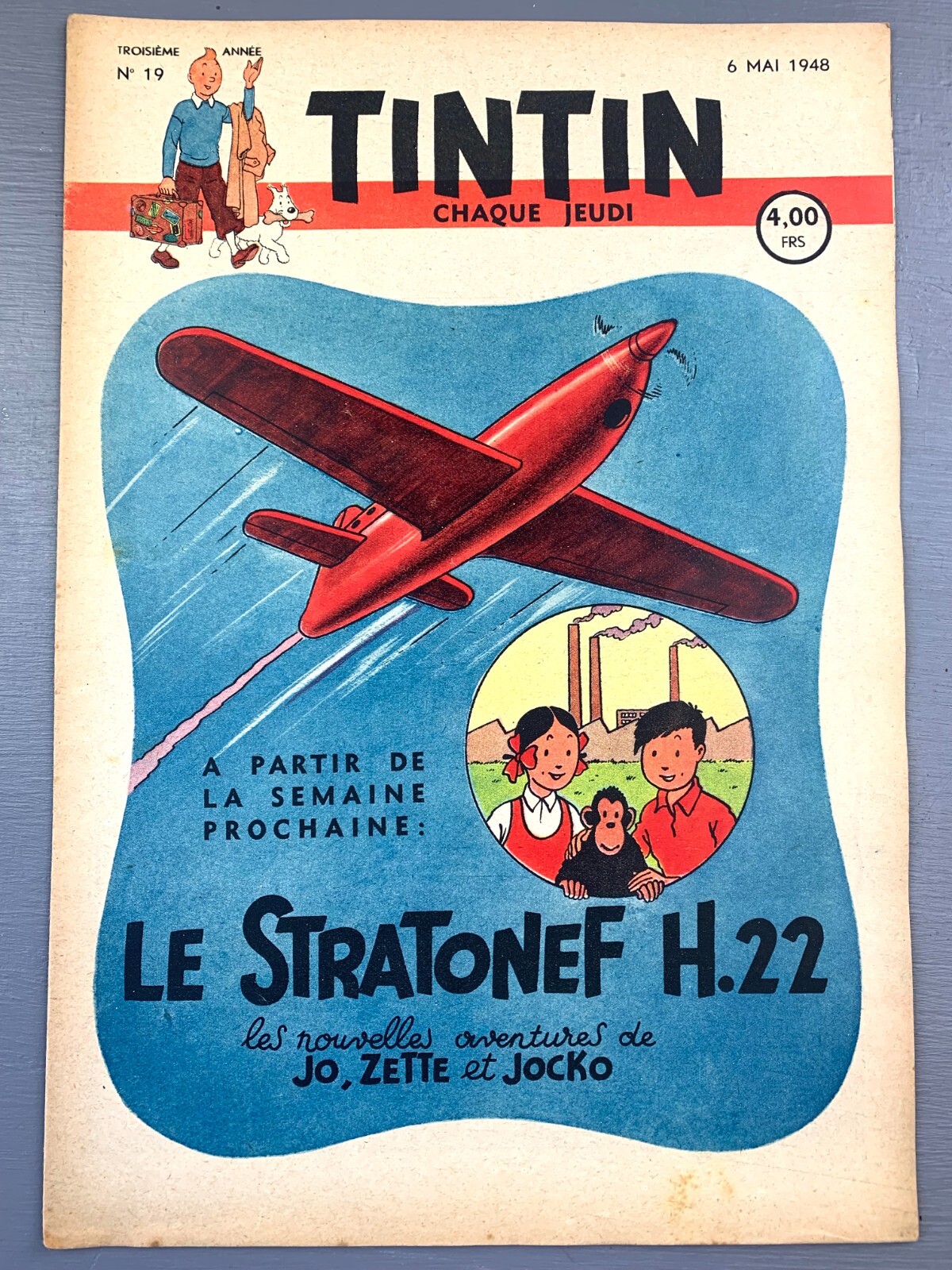 JOURNAL TINTIN Issue 19: 1948 Herge Cover Edition Vintage Comic EO Couverture This is the original 1948 1st Belgian Edition of this issue with a Herge drawn special cover from Jo, Zette & Jocko. It contains strips and features by Herge, including strips from Popol Out West, Quick & Flupke, Blake and Mortimer, Jo Zette & Jocko and more. Rare Tintin items like this are gaining in value right now due to scarcity and age. CONDITION: Excellent condition considering age. Cover is very nice minimal wear only. Pages are very nice throughout with only minimal yellowing. No inscriptions or scribbles throughout. Please see pictures. Sent promptly by recorded delivery, and well packaged. Please see my other nice items up for auction and buy now, including other Tintin treasures, games, electronics and more.