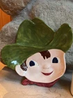 This is a vintage 1950s cup and saucer set featuring an Elf Cowboy design, hand-painted on ceramic pottery. The set includes a cup and a saucer in multicolor hues. The production technique used is pottery, with a painted backstamp indicating the origin and authenticity. This charming and unique set would make a delightful addition to any collection of decorative cookware or dinnerware from the mid-20th century.