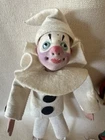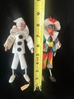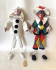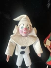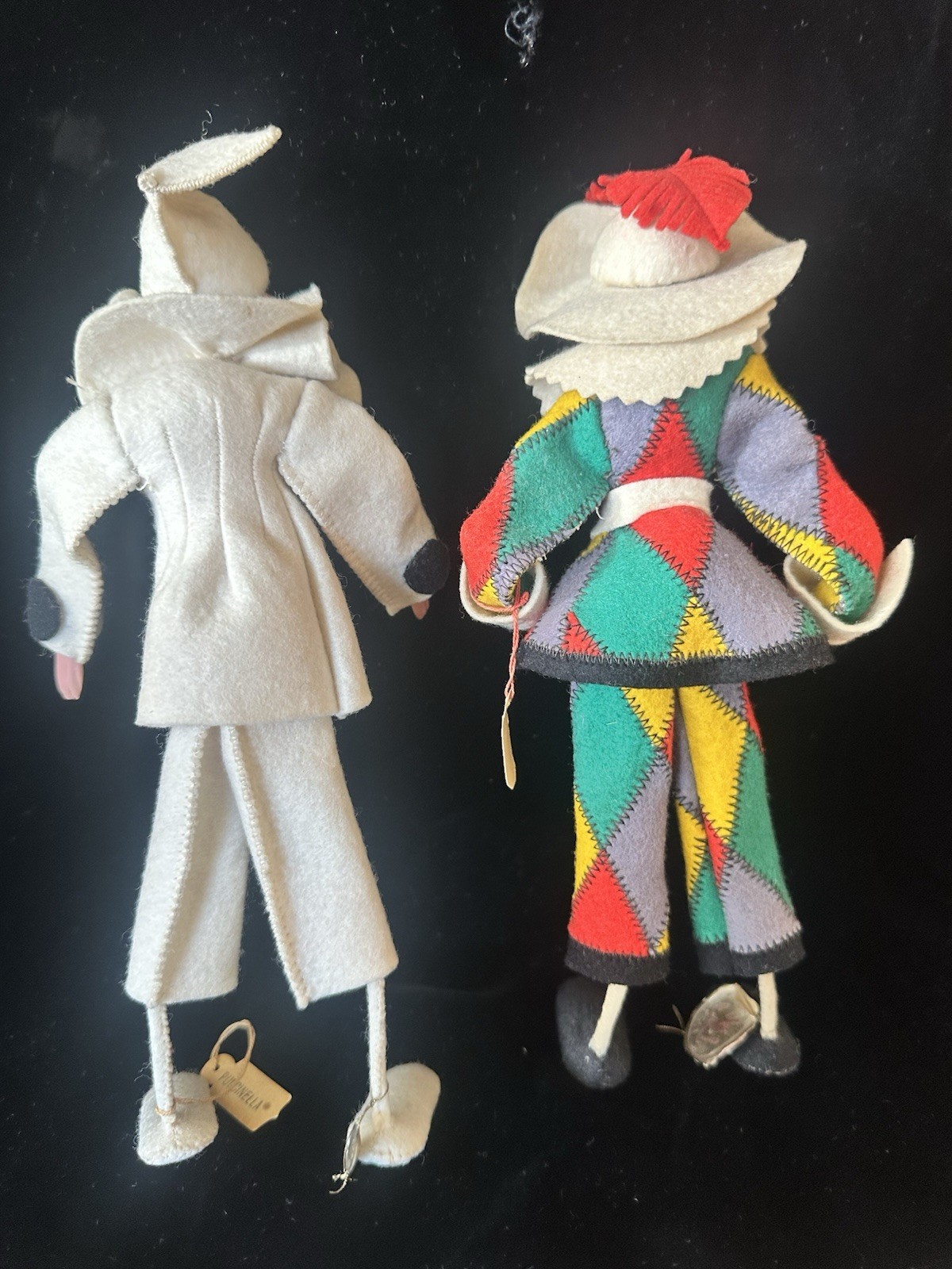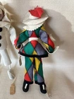 Charming, and wonderful, vintage 1950s, Venice, Italy, harlequin, souvenir dolls. Their handcrafted, felt costumes, and painted, composition, faces are very detailed and expressive. The plastic glass eyes, and painted masks, make each, doll, unique and fun. They’re both in gently used condition with minor flaws. Offering free USPS Ground Advantage shipping! The doll with the patchwork outfit, has a makers, foil tag, on his right ankle. The tag says Creazoni Gipi, Venice, Italy. On the doll’s left hand, is a paper tag, marked, Arlecchino. This doll measures 8” 3/4 tall with its felt, feather on top of the hat. The arm length is 3” 3/4 wide. Both of the doll’s tags, contain minor creasing. There’s also some rabbit fur, for his hair, and is missing some, and sheds at times. There’s some wear/aging stains on the right, coat, sleeve collar, as well as some on his left sleeve arm collar. There’s also some minor paint loss on the dolls’s right hand. There’s also some minor aging on The black and white, costumed doll, measures 8” 1/2 tall and with its arms spread, 3” 1/4 wide. This doll’ has two dark, stains on the middle his mask. There’s also some paint loss on the fall’s upper, left lip. He also has an age again on the back, left, felt collar. This doll has a paper tag, on his right ankle, marked ‘Pulcinella’ which is the doll’s character name. He also has a small, gold plated, foil tag, on his left ankle, marked, Creazoni, Venice Italy, in small writing. No other stains, or damage on the doll’s costume. His legs bend a little, can be repositioned. There’s a loose, string on the back of his collar. They each, stand on their own, but I recommend, some doll stands for extra, stability when displayed. Selling as is/as found, because of the noted flaws, and condition. A must have for unique, Italian souvenir dolls, with a harlequin theme. Guaranteed to add character and fun to your vintage doll collection. Thanks for your consideration!