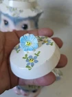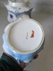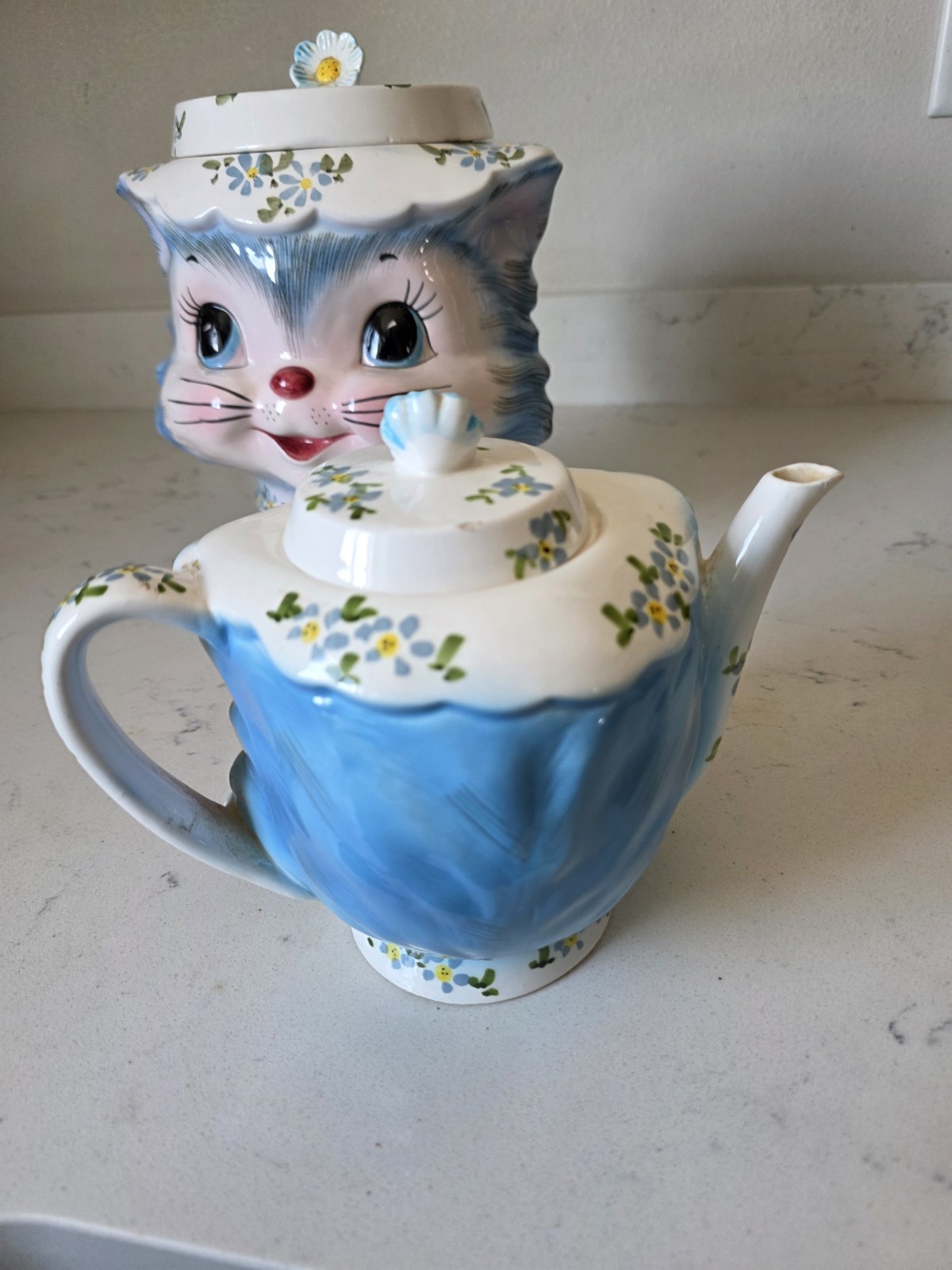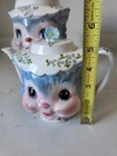 The Vintage 1950s Lefton Miss Priss Kitty Blue Ceramic 4 Cup Teapot from Japan is a charming collectible piece perfect for any vintage lover or tea enthusiast. With its novelty shape and kitchy retro theme, this teapot features a Miss Priss character design in a vibrant multicolor finish. Made of ceramic with a glossy finish, this teapot set includes the teapot and lid, making it a unique addition to any kitchen or home decor collection. Its original 1950s style and Lefton franchise add to its appeal as a vintage treasure. Lid has very small chip in top flower as shown. With sticker.