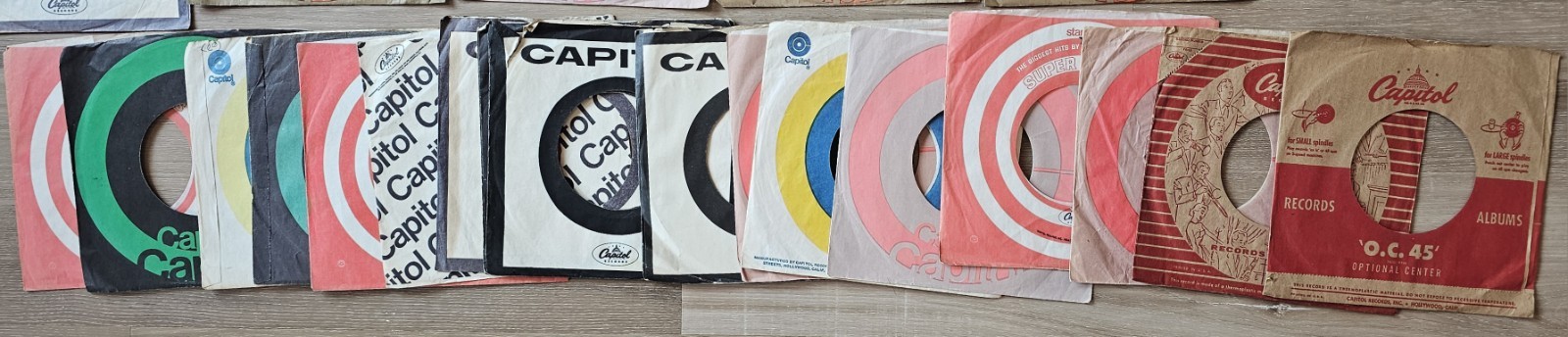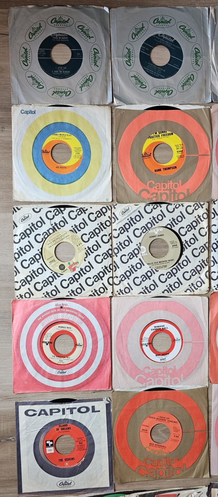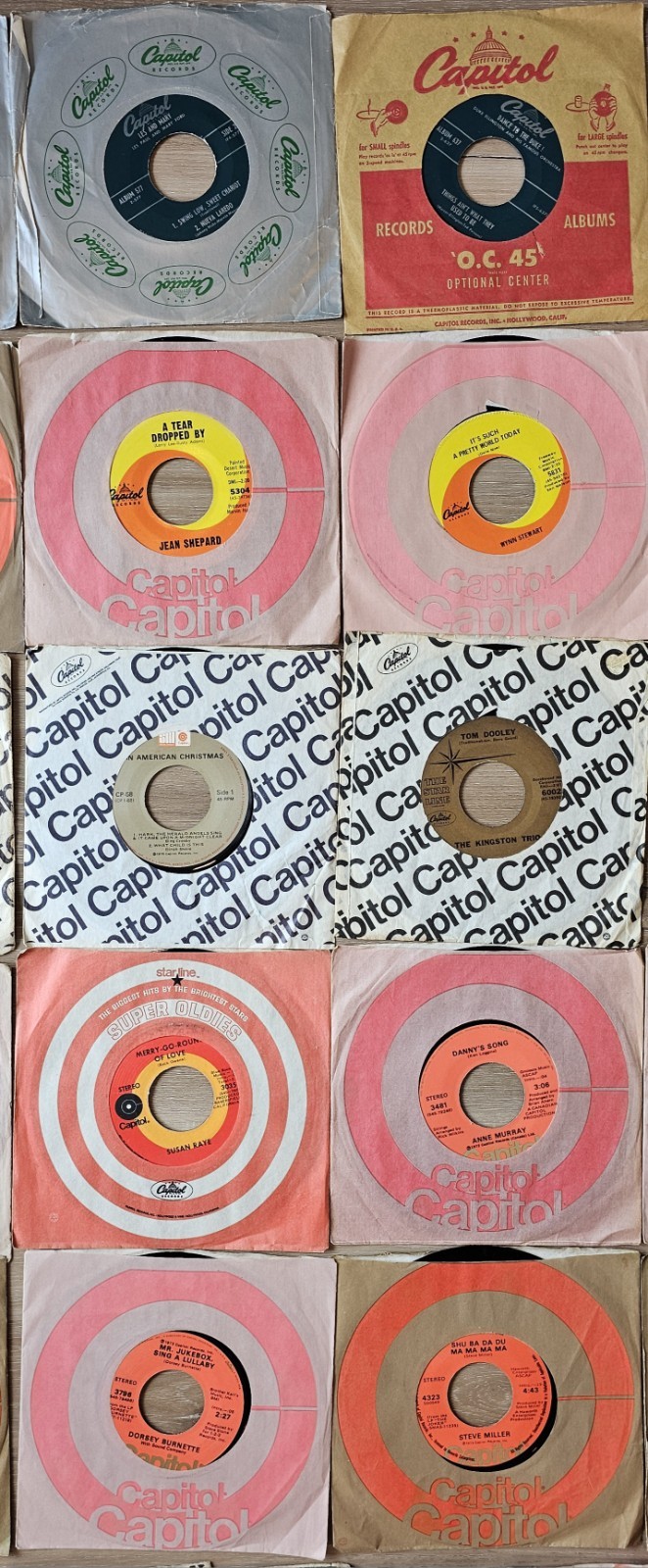 *Records does have normal ware due to age with no cracking, chipping or warping. This lot of 29 vintage 45 RPM vinyl records from Capitol Records features various artists and genres from the 1950s to 1970s. The records come in their original paper sleeves and are in very good to excellent condition. This collection includes a mix of pop, rock, jazz, ballroom, dance, country, folk, classical, and blues music, capturing the sounds of the era. Made in the United States, these 7-inch records offer a glimpse into the music scene of the time.
