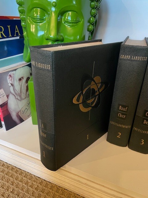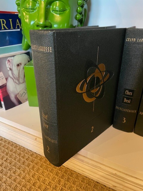 Grand Larousse French Encyclopedia - 10 Volumes AKA “Grand Larousse Encyclopedique en Dix Volumes” Published 1960 Publisher: Librarie Larousse Paris Published as both a dictionary and encyclopedia. Content consists of printed text, photos and drawings covering all topics. Black hardcover with gold-embossed lettering and logo I am the original owner. These have been in my family for 65 years. All bindings, spine and pages are in excellent shape. No tears or stains Dust jackets are included but are torn at the edges (see photo) 10 volumes in total - will be shipped in 2 separate boxes