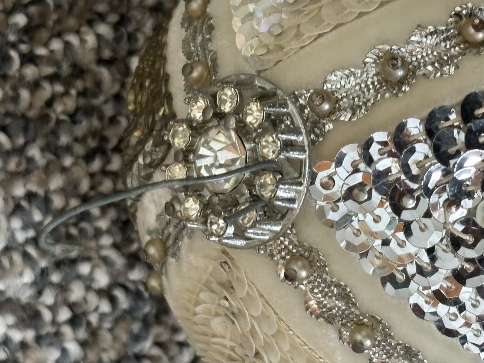 Vintage 1960’s Christmas tree ornament silver pin sequin satin and lace Has some age related wear Smoke free home Any questions please contact me before purchasing this vintage item Please read entire description and examine all photos before purchasing I always combine shipping on multiple purchases