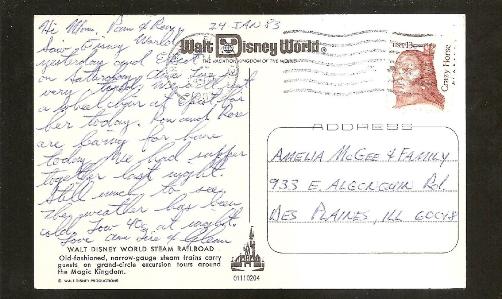Vtg 1970's Chrome Postcard WALT DISNEY WORLD, FLORIDA - STEAM RAILROAD USED OR UNUSED POSTALLY = USED canceled 1983 CONDITION = VG APPROX. SIZE IS 5.5 BY 3.5" ( PLEASE SEE SCANS FOR CONDITION ) Don't forget to check out my other simillar items up for sale, and my many other auctions. Check out my other items ! Be sure to add me to your favorites list ! I DO COMBINE S/H FREE SHIPPING ON ALL ADDITIONAL POSTCARDS WON S/H COSTS FLAT RATE FOR 1 OR 100 POSTCARDS