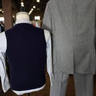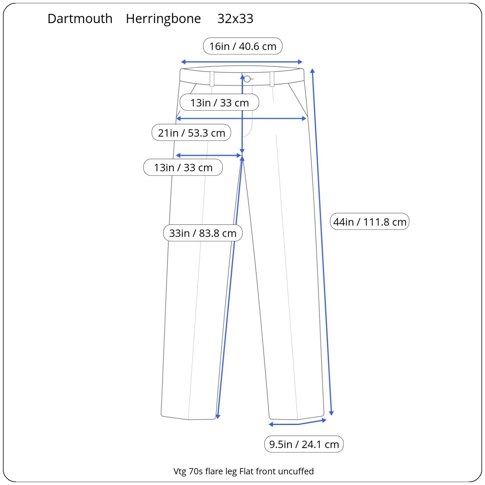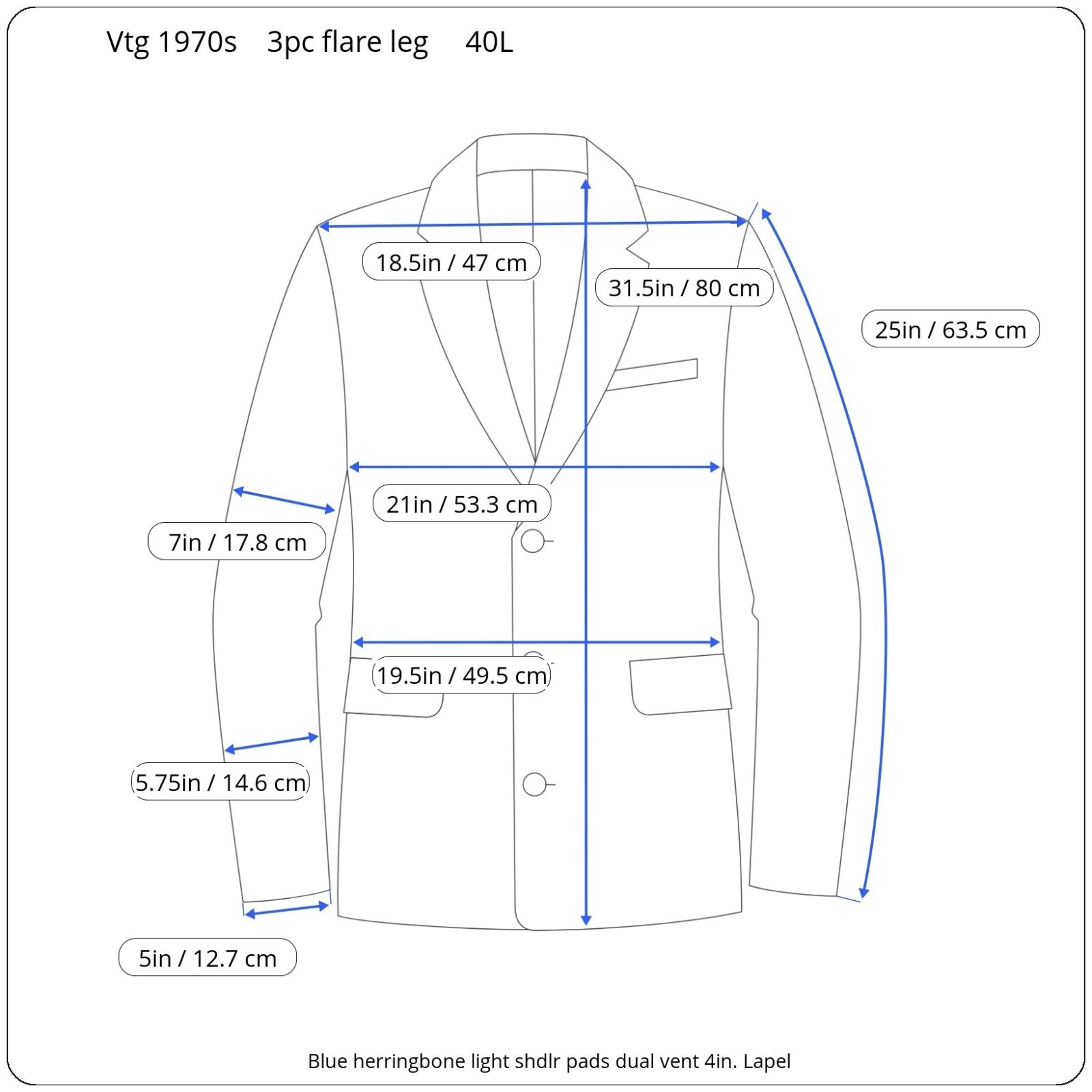 Size:measures as a 40L USA with 25-inch arm length and a jacket length of 31.5 inches. Pictured on a size 40 mannequin Pants: 32x33 For complete measurements, see photos #2, #3, and #4 To see exactly how we measured, see the last series of photos. Extra fabric for adjustments: Waist: 3 inches Inseam: 3 inches Arms: 1 inch Color: light blue Condition: excellent vintage condition. No holes. No snags. No smells, no stains, no real flaws found other than very very light discoloration in the armpit liner. No size or fabric tags. I belive the fabric to be a heavy wool light poly blend. Flare leg, light shoulder pads, patch pocket, vtg 1970s, sweater vest, midweight, 4 inch lapels Return policy: We offer free shipping and no returns. We can not afford to offer both in the highest return category on eBay. It becomes very expensive to mail out items for free for people to try on if they are not confident in checking the measurements in picture #2. If you prefer to have the ability to return the item and pay $12.95 shipping, please send us a message, and we can change the listing format to offer returns. The $12.95 shipping cost would break us out even in the case you needed to return the item. You must contact us before purchasing as some of our items are on consignment and we will need to get the owners approval before proceeding. We ship the next business day after the payment is made