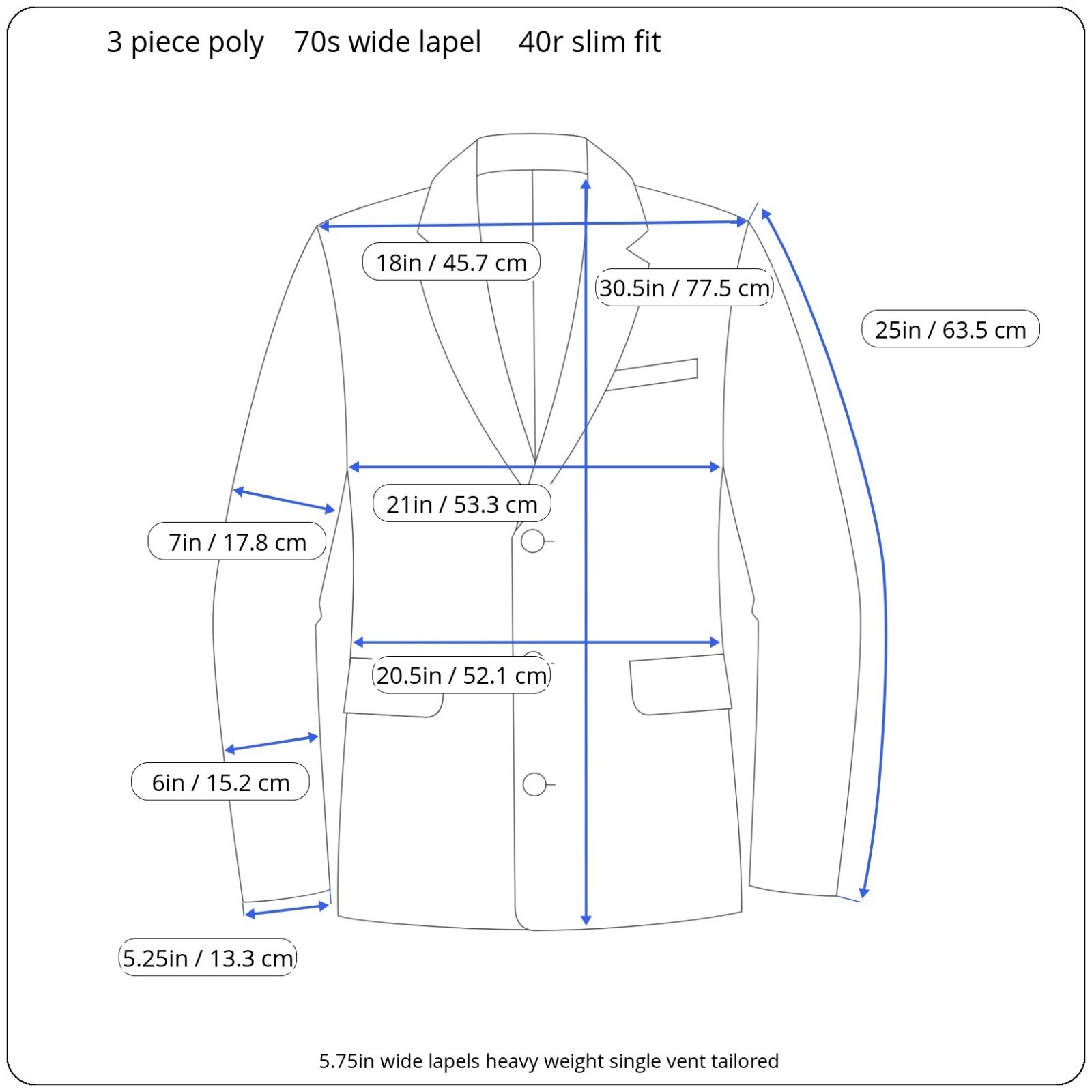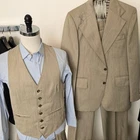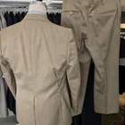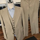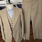Size: 40r slim fit USA with 25-inch arm lengthand a jacket length of 30.5 inches. Pants: 34x30 flared leg, near bellbottom leg hem For complete measurements, see photos #2, #3, and #4 To see exactly how we measured, see the last series of photos. Extra fabric for adjustments: Waist: 3 inches Inseam: 3 inches Arms: 1 inch Color and fabric: heavy weight light brown polyester Condition: good vintage condition, no major flaws were found. No holes, no snags, no smells, the armpit liner has very light discoloration, see photos. Heavyweight 3 piece tailored polyester suit, flared leg, near bellbottom leg hem, flat front, uncuffed, light shoulder pads, 5.75 inch wide lapels Return policy: We offer free shipping and no returns. We can not afford to offer both in the highest return category on eBay. It becomes very expensive to mail out items for free for people to try on if they are not confident in checking the measurements in picture #2. If you prefer to have the ability to return the item and pay $12.95 shipping, please send us a message, and we can change the listing format to offer returns. The $12.95 shipping cost would break us out even in the case you needed to return the item. You must contact us before purchasing as some of our items are on consignment and we will need to get the owners approval before proceeding. We ship the next business day after the payment is made