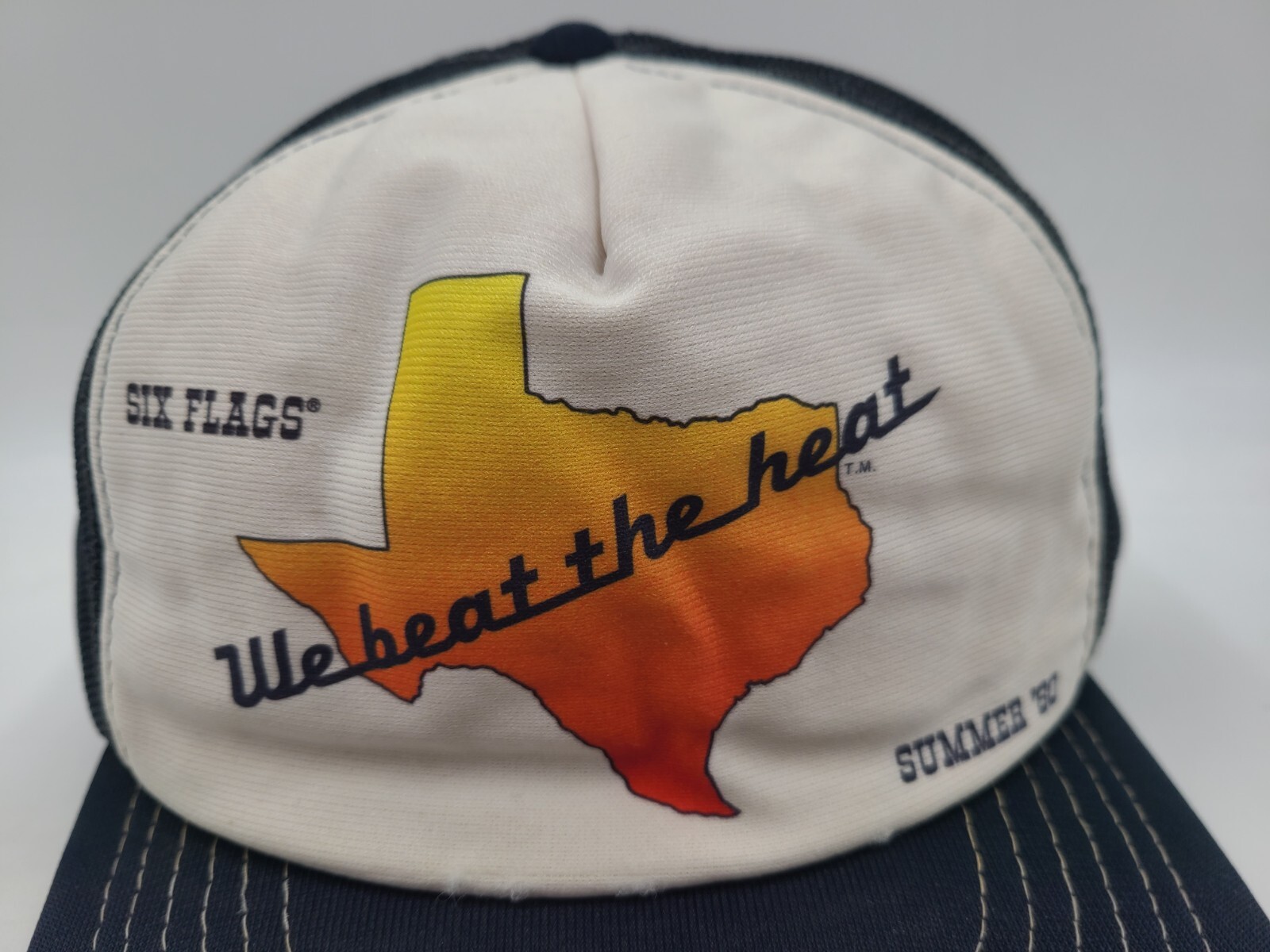 The hat seems best suited for smaller sized heads. Also has some stains underneath the brim as seen in photos. Vintage Six Flags Texas We Beat The Heat 1980 Mesh Snapback (Fits Small) Hat Cap. EACH ADDITIONAL HAT PURCHASED IS ONLY $1 ADDED SHIPPING!