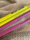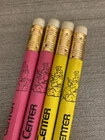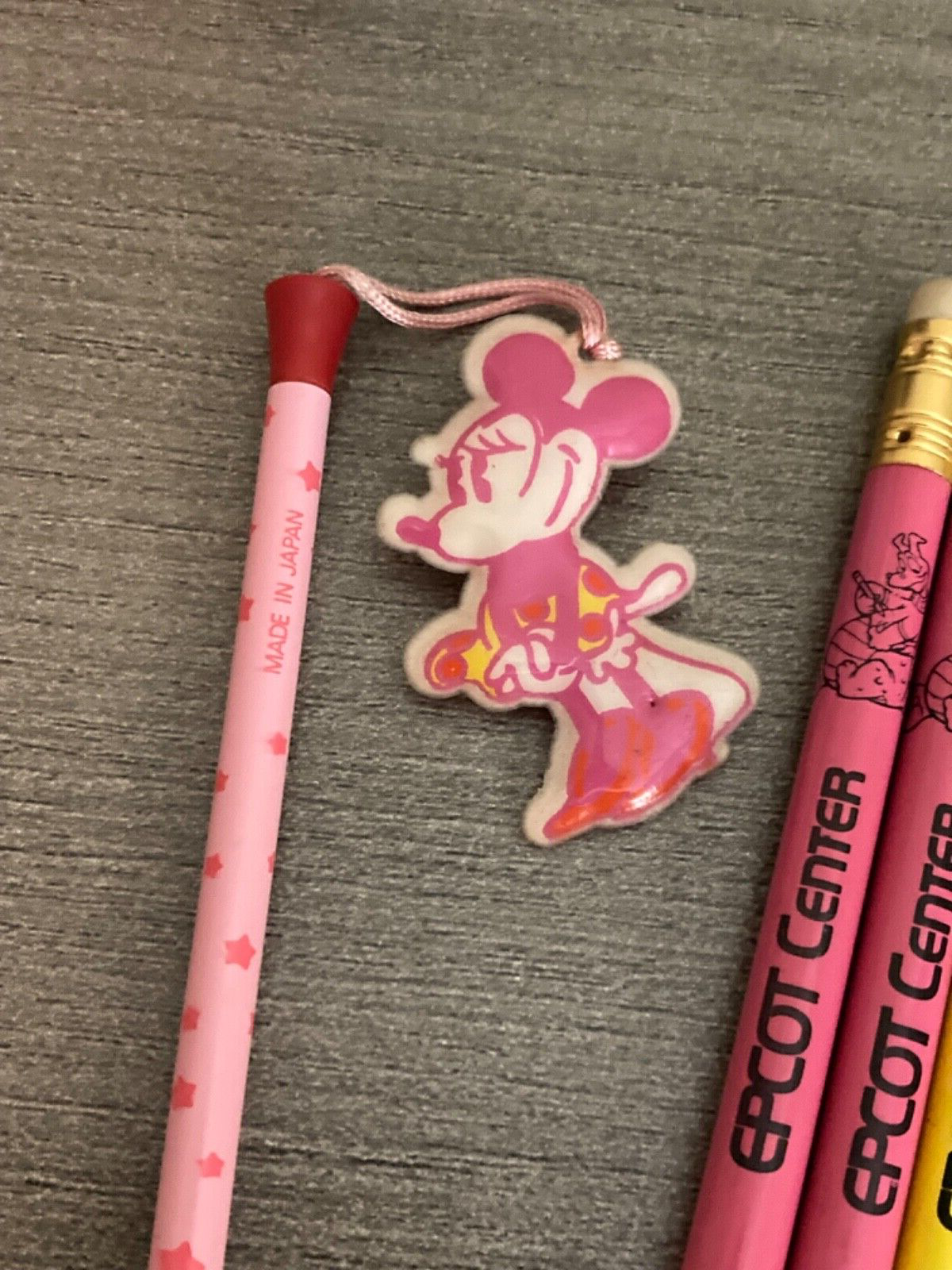 For sale are 7 vintage Disney pencils. 4 are from Epcot Center. Two are yellow and two are pink. These are unsharpened have been stored away for years, but the erasers have dark spots on them and may not work. The pencils also have some scratches and marks. 2 are from Walt Disney World. One is blue and one is yellow. The erasers have spots on them and are discolored. The pencils have some marks and scratches on them. 1 is thin/small and light pink with dark pink stars. It has a puffy, Minnie Mouse hanging from the top. There is a pinhole on each side of the puffy Minnie Mouse. These can be seen in the pictures. This pencil has been sharpened and used. Please see the pictures for the condition. I do not accept returns, so all sales are final. Shipping through USPS ground advantage is $5.00.