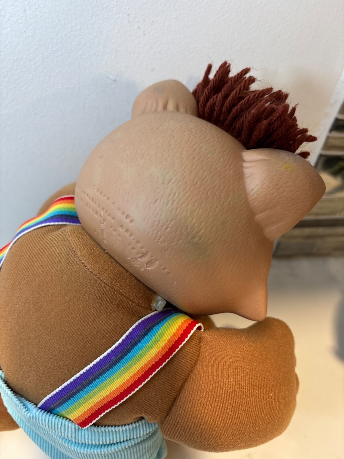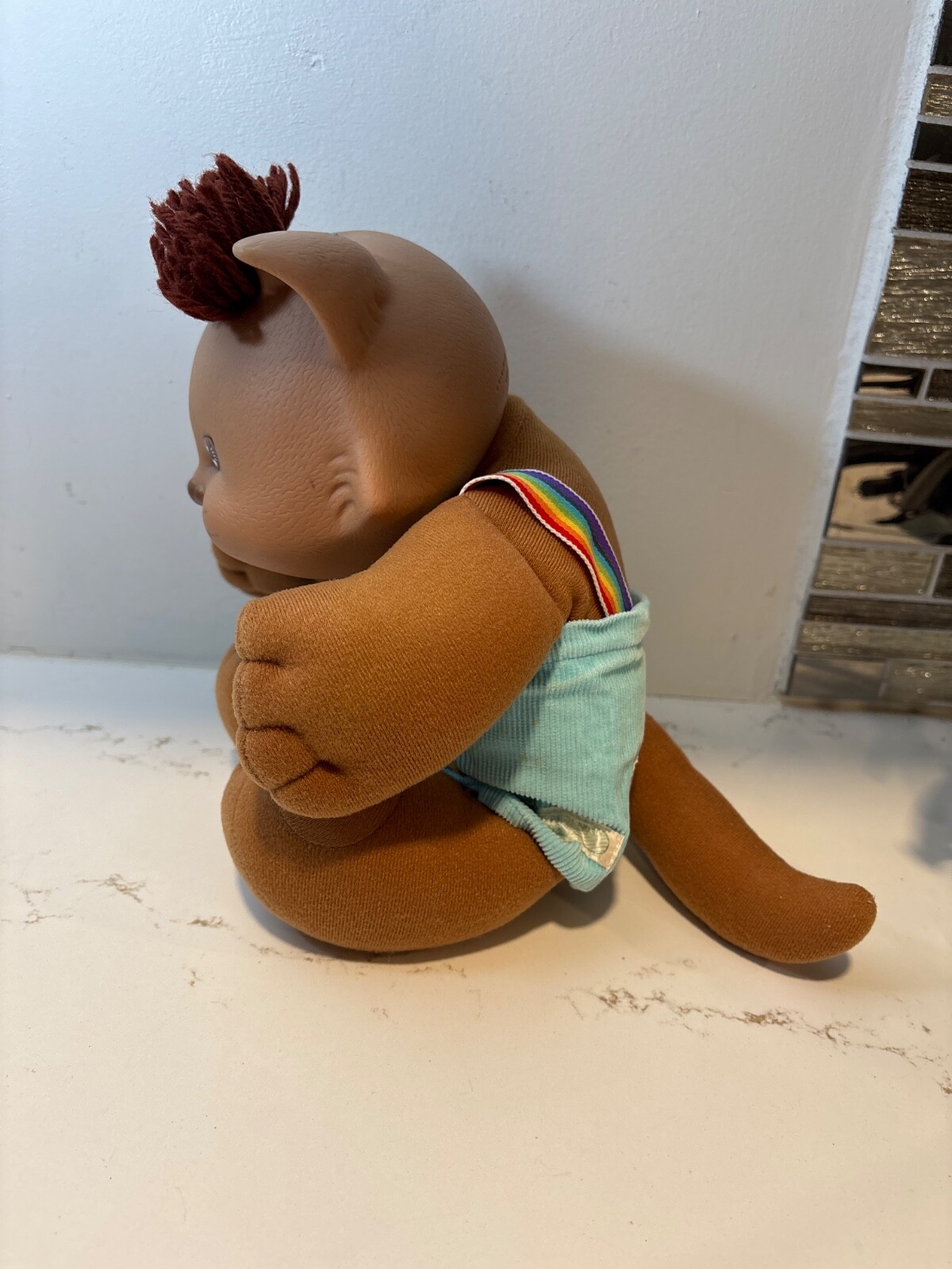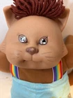 The Vintage Cabbage Patch Kids Koosas KitTY Cat with Brown Rainbow Suspenders from 1985 is a collectible doll in the Koosas product line. This single unit cat doll features brown hair and eyes, making it a unique addition to any doll collection. As an antique item from the 1980s, this Cabbage Patch Kids doll brings nostalgia and charm to its new owner for all occasions. Made in China, this vintage cat doll is a special piece for collectors or fans of Cabbage Patch Kids dolls.