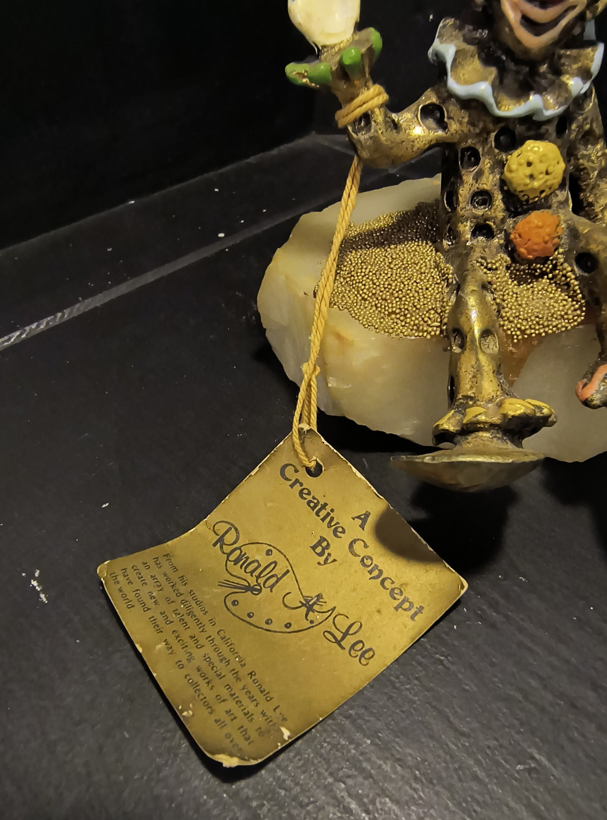 Vintage Ron Lee Waving Clown Sculpture 4.5 Inches 1986 This is a Ron Lee Clown figurine, a collectible sculpture known for its 24K gold-plated details and hand-painted features. Here's some helpful information about it: Artist: Ron Lee (1947-2001) was an American artist famous for his whimsical clown figurines. Material: The figurine is made of pewter with 24K gold plating and sits on a stone or marble base. Signature: Most Ron Lee figurines are signed and dated by the artist. The one in the image is signed "Ron c86". Year of Production: 1986 Design: The clown is sitting and waving, with a polka-dot outfit and a ruffled collar. Collectibility : Ron Lee's clown figurines are popular among collectors, and their value can vary depending on the rarity, condition, and age. Care: These figurines should be handled with care to avoid damage to the delicate gold plating and paint.