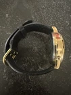 This vintage Armitron wristwatch features a playful cartoon theme with a two-piece strap and round indexes. The gold bezel and case give it a classic and casual style, while the black leather band adds a touch of sophistication. The watch has a seconds hand and 12-hour dial, and is equipped with a voice watch feature that celebrates the voices of Looney Tunes characters Bugs Bunny and Daffy Duck. The watch is made of stainless steel and quartz movement, and is unisex. It was manufactured in 1998 and is a vintage piece. The watch is in good shape but I have not tested to see if it works. It might need batteries or it could be used for parts. Please view all of the photos.