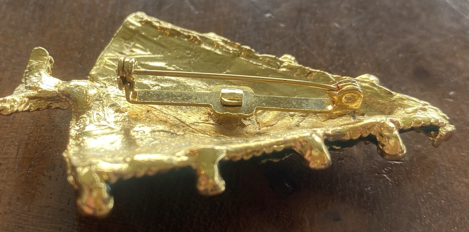 This vintage 2 1/2” Gold Tone Christmas Tree Brooch Pin features red and green enamel accents. It is a festive and elegant accessory for the holiday season. The brooch is of retro design, perfect for anyone who appreciates classic vintage jewelry. The Christmas tree shape adds a playful and whimsical touch to the overall design, making it a standout piece in any jewelry collection. Smoke free, pet free home. Always combined shipping. Shipped by USPS Ground Advantage.