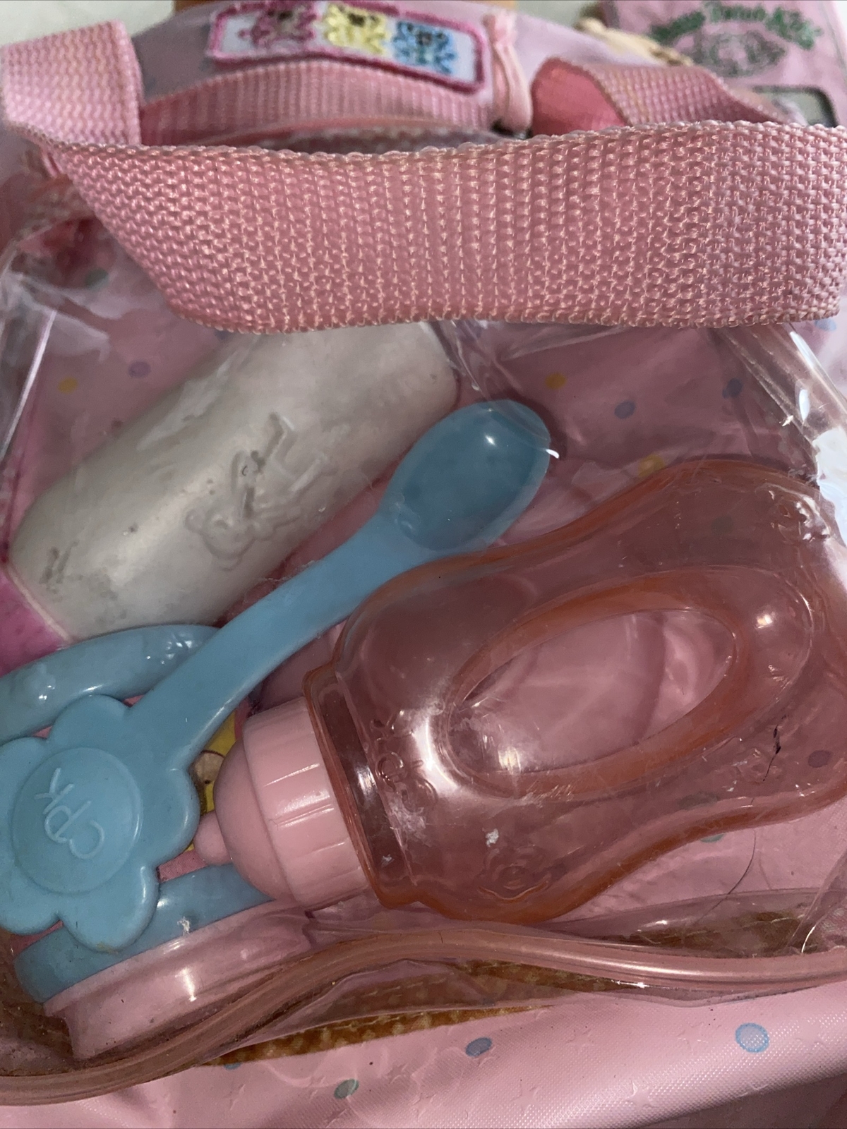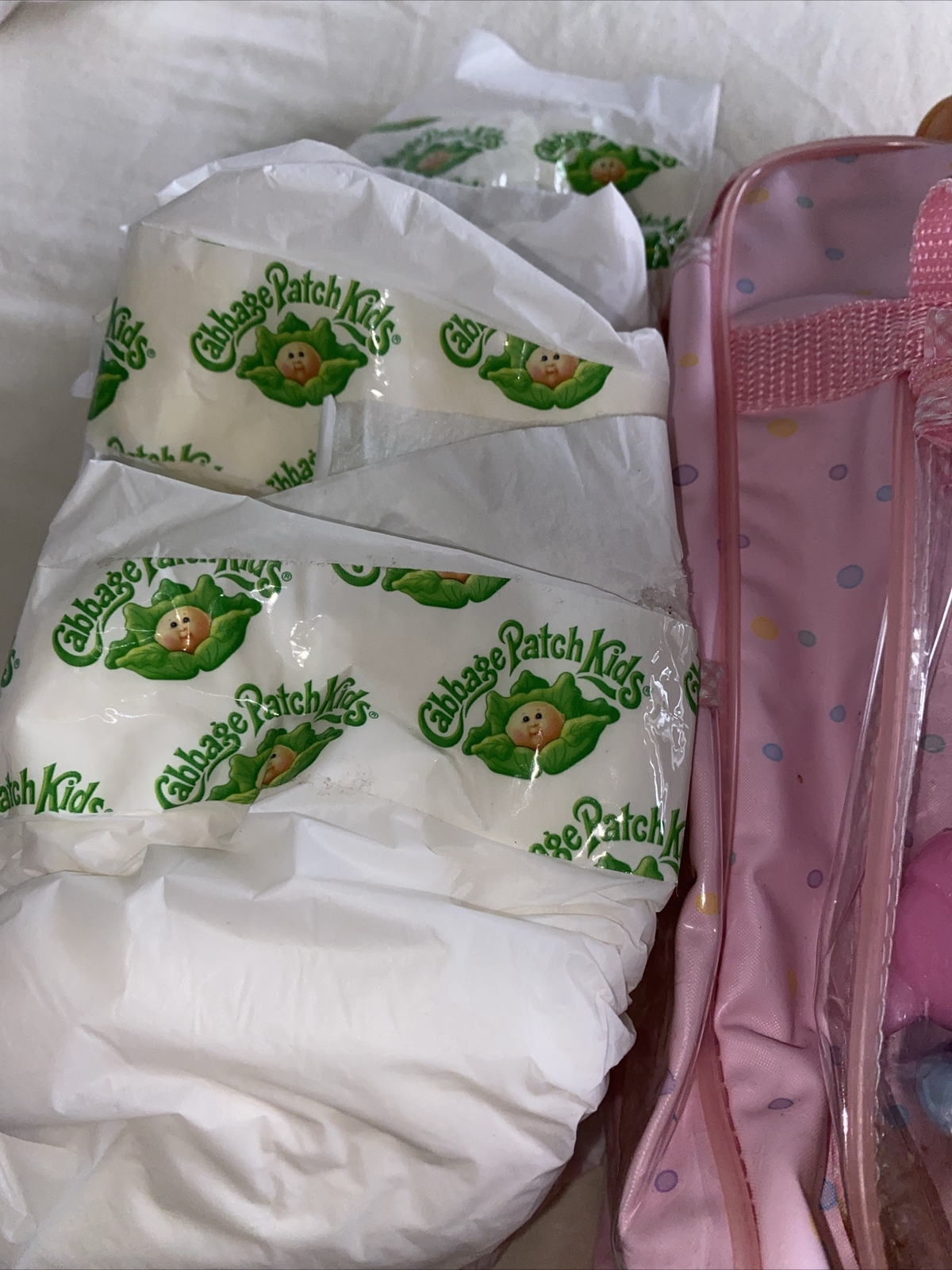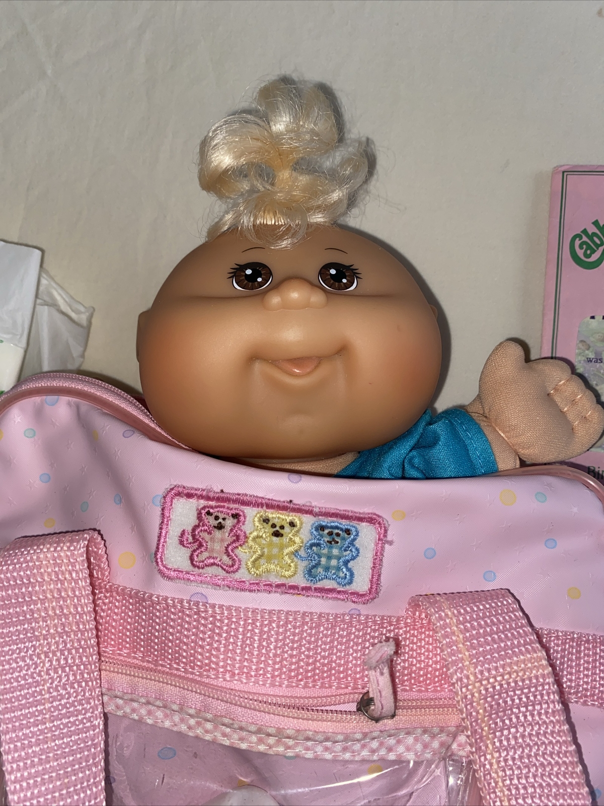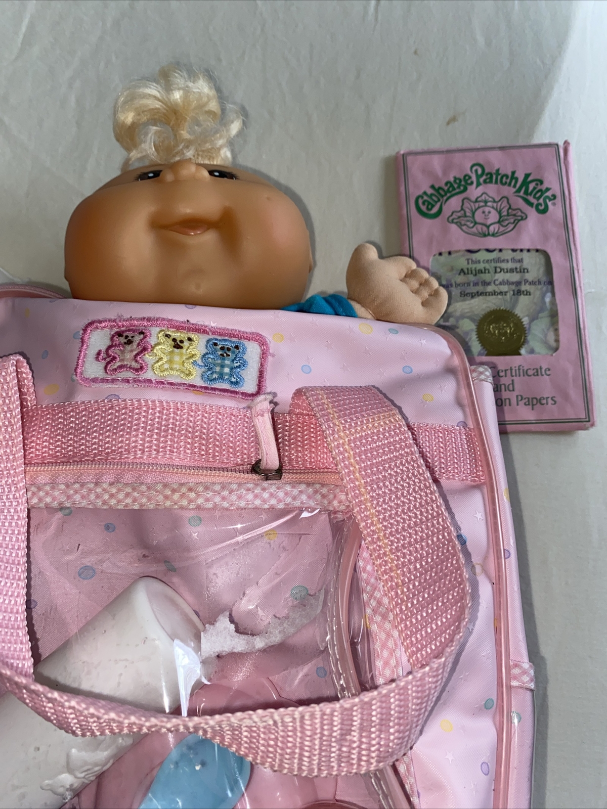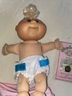 This is a vintage Cabbage Patch Kids baby doll, manufactured in 2009 in China. The doll is a boy with blonde hair, blue eyes, and comes with a diaper. The doll is made of polyester and is part of the Cabbage Patch Kids franchise. The doll is sold without packaging and includes diaper bag yThe doll is Jak’s 2009.