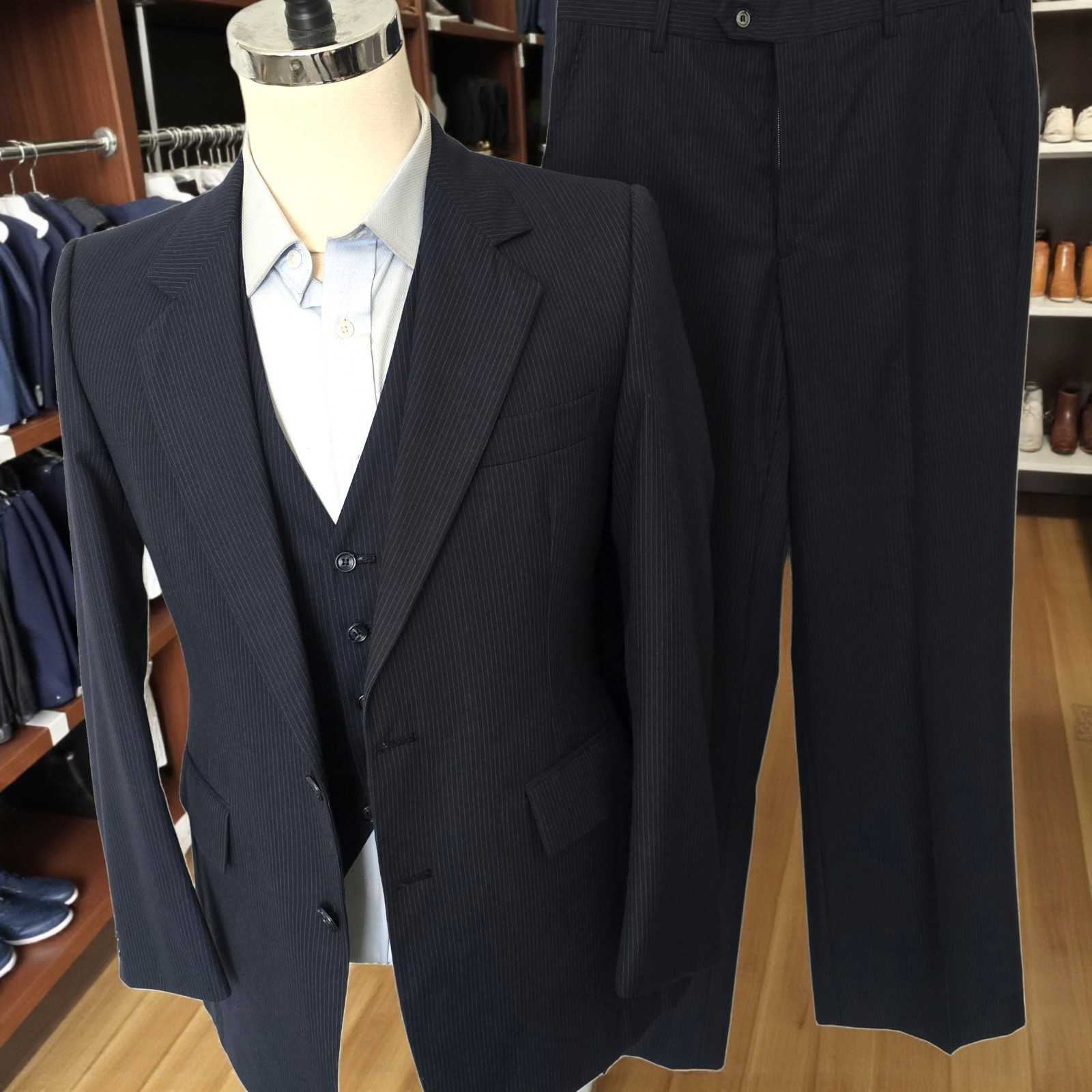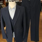 Size: 38L SLIM FIT (narrow shoulders) USA ***with 25-inch arm length and a jacket length of 31 inches. Pants: 31x32 drop 7 pronounced 1970s flare leg For complete measurements, see photos #2, #3, and #4 To see exactly how we measured, see the last series of photos. Extra fabric for adjustments: Waist: 2.25 inches Inseam:2.25 inch Arms: 1 inch Color: navy pinstripe. I belive the fabric is wool but no fabric tag. Condition: good vintage 70s condition, no holes, no stains, no smells, minor snag/ (see last photograph) 1970s tailoring, flare leg, wide hem, light shoulder pads, dual vent, flat front, lightweight to midweight wool Return policy: We offer free shipping and no returns. We can not afford to offer both in the highest return category on eBay. It becomes very expensive to mail out items for free for people to try on if they are not confident in checking the measurements in picture #2. If you prefer to have the ability to return the item and pay $12.95 shipping, please send us a message, and we can change the listing format to offer returns. The $12.95 shipping cost would break us out even in the case you needed to return the item. You must contact us before purchasing as some of our items are on consignment and we will need to get the owners approval before proceeding. We ship the next business day after the payment is made