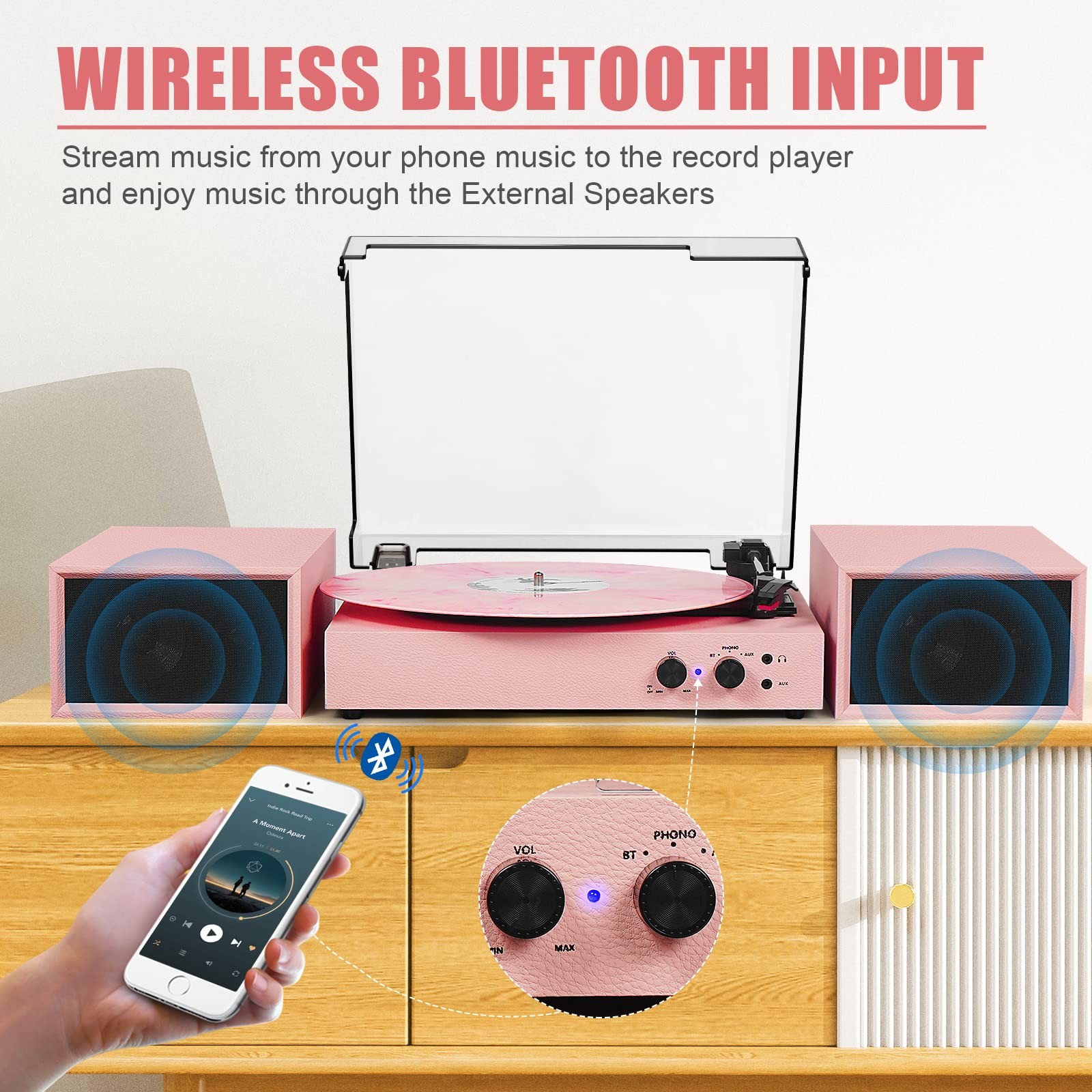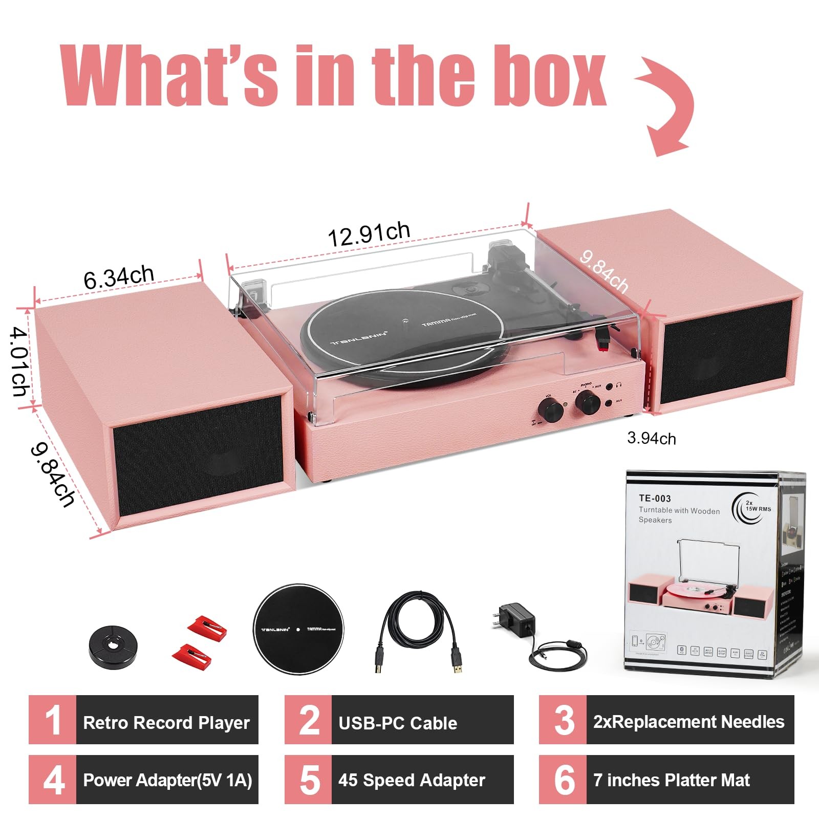 pink record player turntable and bookshelf speakers work together with greater potential. They are more than ready to provide the listener with the finest sound. Equipped with 33⅓ 45, 78 RPM speeds, vinyl record player supports all 7", 10"& 12" vinyl records including protective auto-stop function enables to stop automatically when a record ends. 【Pink Record Player】 - Comes with a pair of matching separable pink speakers, the pink record player for vinyl is a complete all-in-one system, let you enjoy loud and dynamic vinyl audio sound. Supports RCA output connection to your own externally-powered speakers. Tip: Connect the pair of pink speakers only to the [SPEAKER OUT] jacks. 【Elegant&Vintage Looking 】- Turntable with speakers is simplistic yet elegant, it features a vintage aesthetic, adding a touch of retro vibe to any room. Two bookshelf speakers not only works as capable music station but offers multiple placement options as turntable base or record. 【Wireless Bluetooth Input】 - Built-in with Bluetooth receiver, stream your favorite phone playlist wirelessly to the turntable. And through the Bluetooth pairing up with the turntable, you can enjoy the premium sound from the dual external speakers. 【33, 45, 78 RPM SPEEDs & Auto Stop】Equipped with 33⅓ 45, 78 RPM speeds, vinyl record player supports all 7", 10"& 12" vinyl records including. Protective auto-stop function enables to stop automatically when a record ends. 【USB to PC Recording】- Easy convert your records into digital files and preserve on your computer, with the included USB-PC cable. AUX line-in connection for wired audio devices. 3.5mm headphone jack for your listening in private. A perfect gift for any music lovers or whom enjoy interior design or decorating their homes.