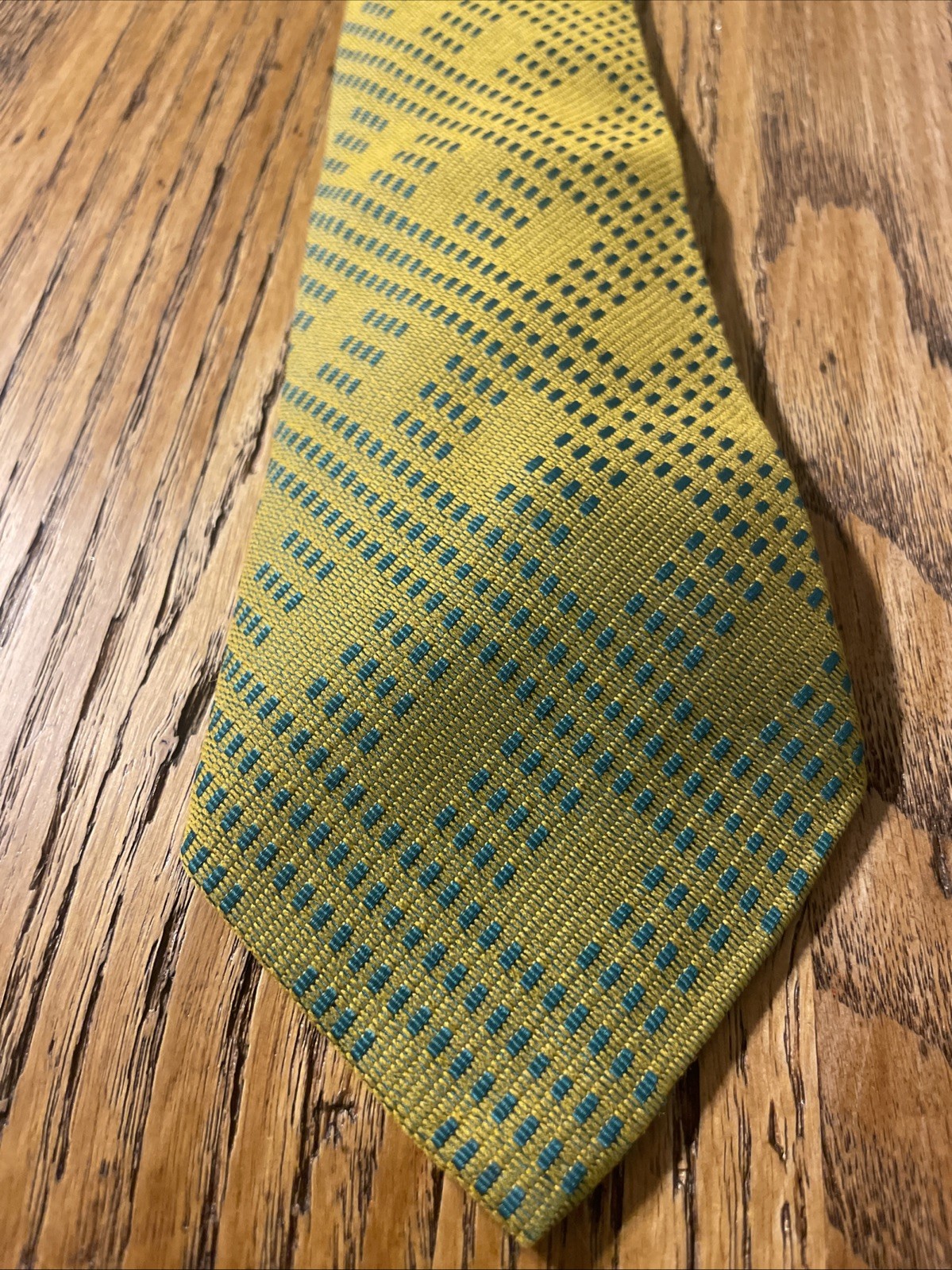 The product is a vintage 60s acetate wide tie with a geometric pattern in multicolor, perfect for those embracing a retro Mod or Disco style. Made in the United States, this woven tie adds a touch of nostalgia to any outfit. The wide width and textured material make it a standout accessory for men looking to channel their inner 60s fashion icon.