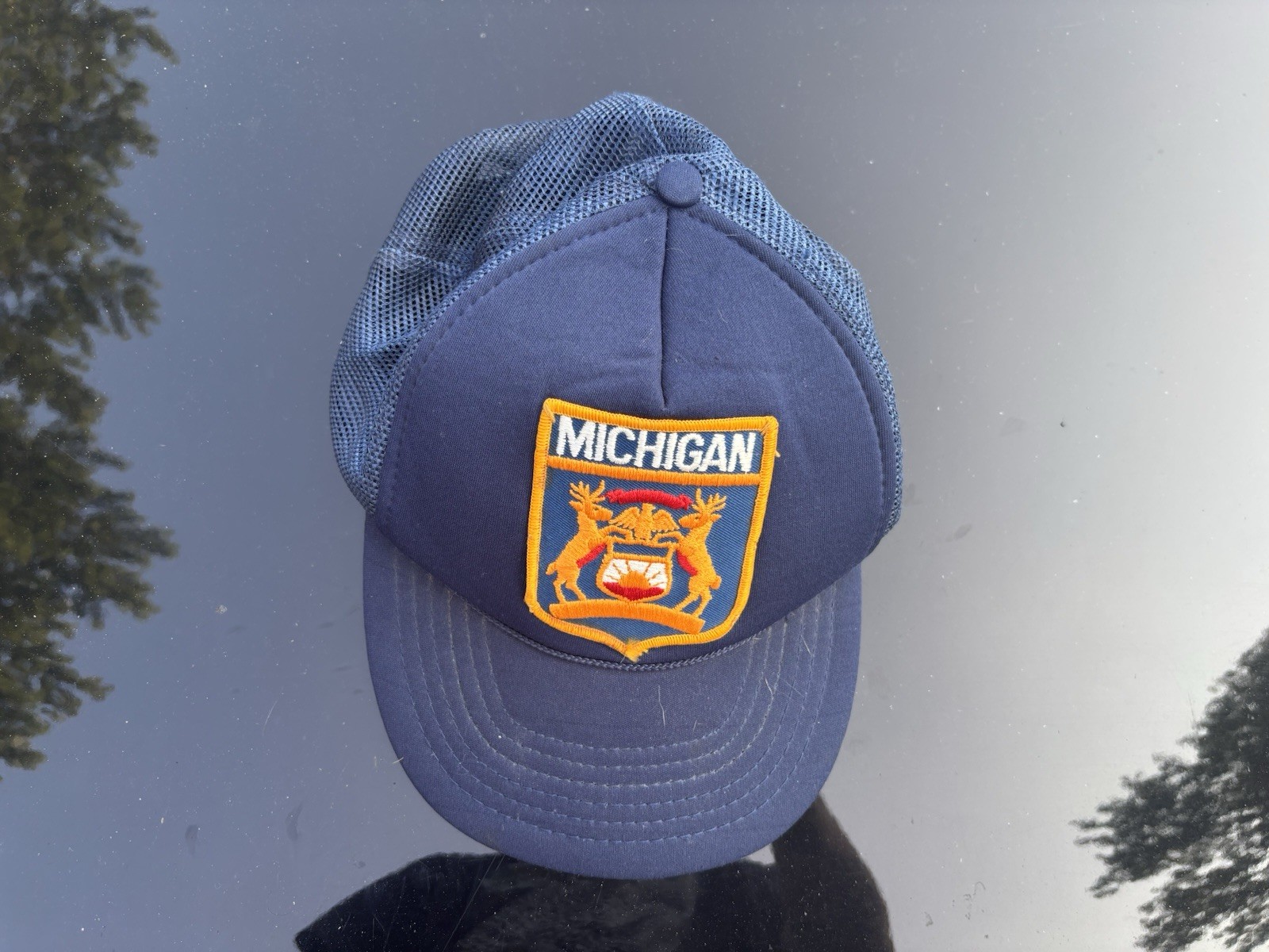 This Vintage 80s Michigan State Seal Trucker Hat is a stylish and lightweight option for men looking to add a touch of retro flair to their outfit. Made from polyester and foam, this snap-back cap features a solid blue color with the classic Trucker Hat style that is perfect for casual occasions or travel. The adjustable design and breathable mesh back making it ideal for the warm seasons of summer, fall, and spring. The vintage design with a nod to 80s style and USA theme adds a unique and nostalgic touch to complete any outfit.