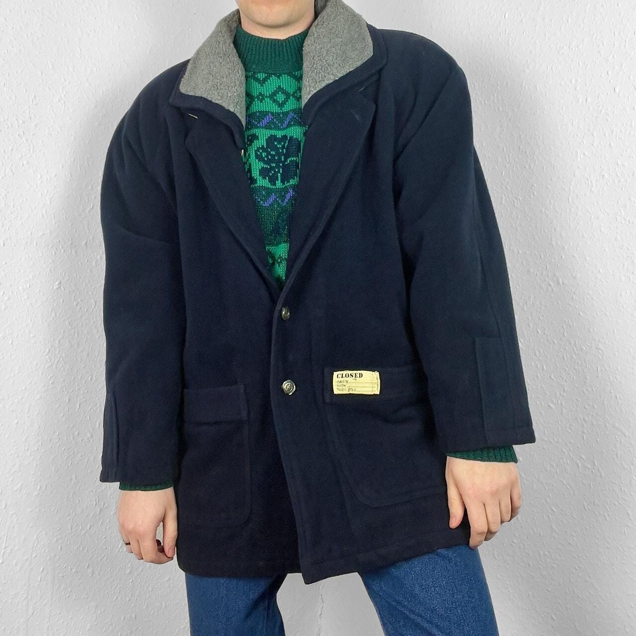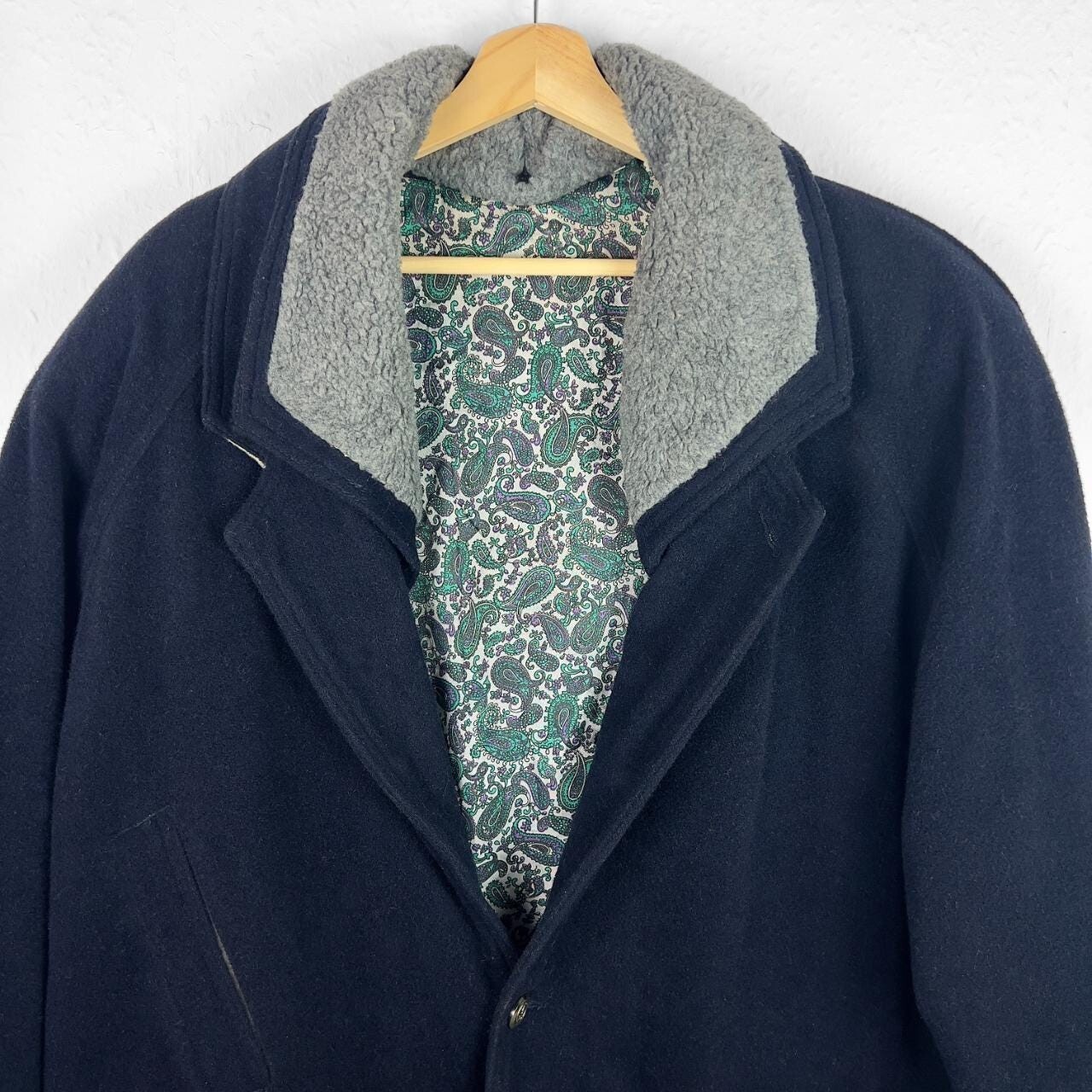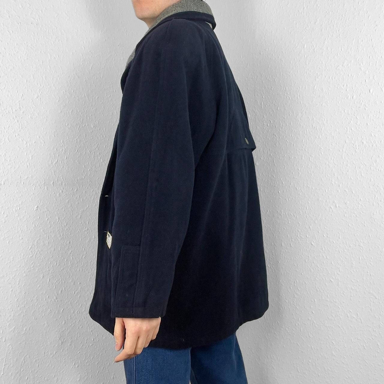 Vintage wool overcoat in dark navy blue with contrasting grey collar. Material is a wool blend knit. Has button up front, twin hip pockets & shoulder pads plus paisley pattern lining. Great condition, labelled size XL or suits smaller oversized, measurements below Length: 33 inches Pit to pit: 28 inches £3 UK P&P 💌 Model is 5’9 and a men’s medium Please get in touch for more measurements All items are second-hand so please expect small signs of wear - any major flaws will be noted