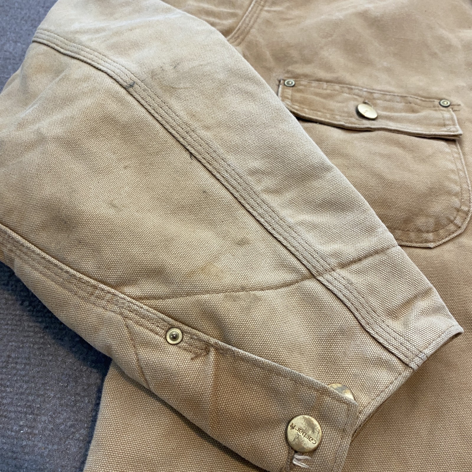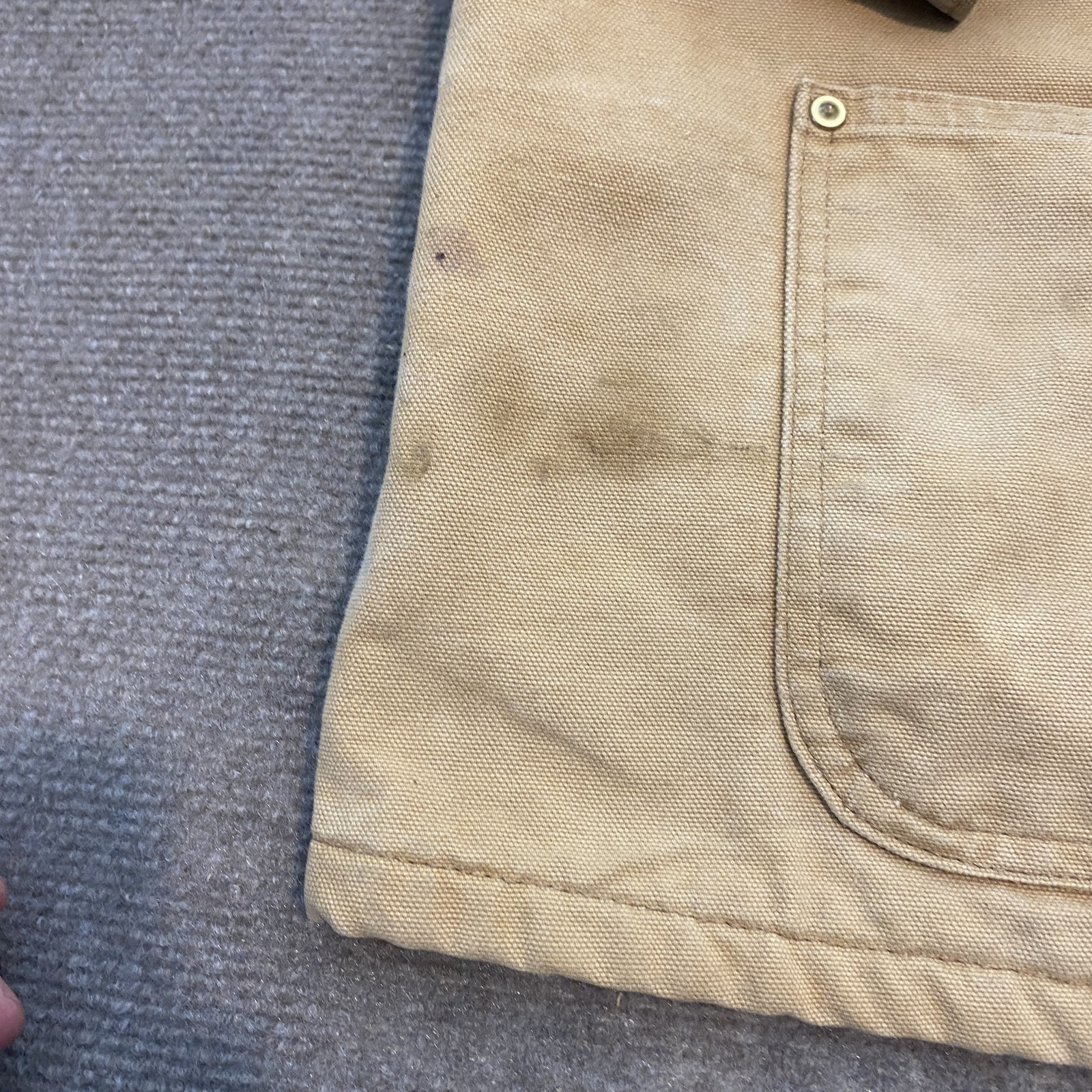 This vintage Carhartt chore jacket is a solid find—built tough with that classic workwear look. The blanket lining adds warmth, and the brown canvas has a nicely broken-in feel. Light fading and wear give it character, but no major flaws. Roomy fit, sturdy pockets, and the corduroy collar is a nice touch. Perfect for layering or tough jobs. Great condition for its age!