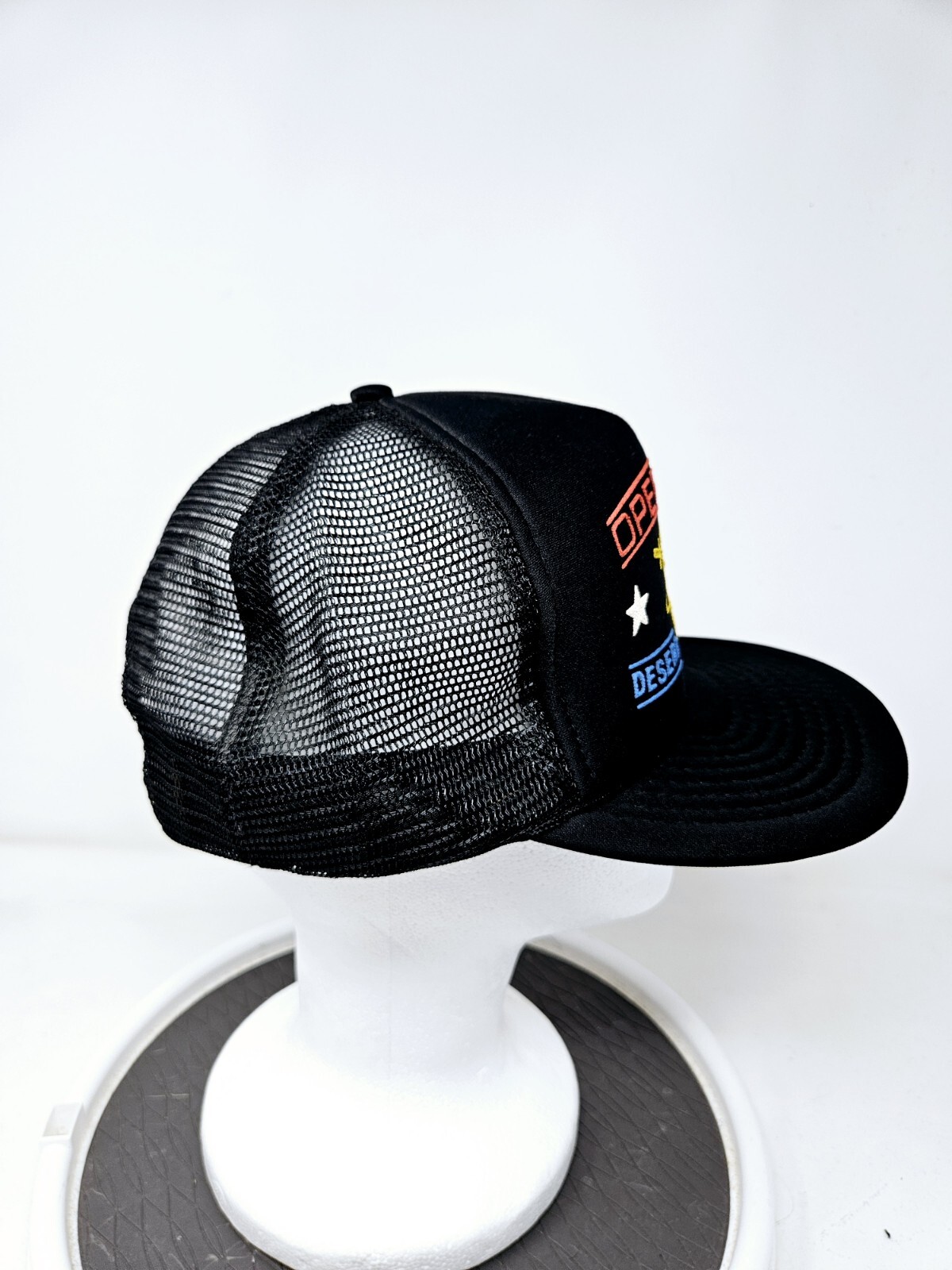 This vintage Desert Storm trucker hat is a cool retro find! The black mesh fits comfortably, and the worn-in look adds character. Super fast shipping—arrived in perfect condition as shown in the pics. Great addition to any 90s collection!