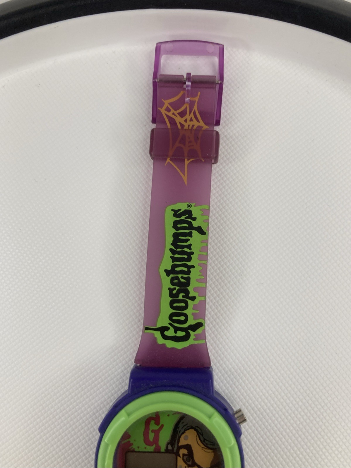 The product is a vintage 90's Goosebumps Slappy the Dummy digital watch by Nelsonic. This unisex kids wristwatch features a quartz movement and LCD display, showcasing the iconic character from the popular horror series. Perfect for fans of R.L. Stine's beloved books, this unique timepiece is sure to add a quirky and nostalgic touch to any outfit. See photos for details of condition. Band has a puncture causing missing paint. The watch is no longer functioning and I cannot guarantee its operation. I have not replaced the battery to try to test it. This item should be considered as a for collectible only. No returns accepted.