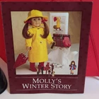 Vintage 1990s Molly McIntire orginal Pleasant Company American Girl doll. Molly is dressed in her Winter Story / Changes for Molly yellow rain coat and hat with red boots and umbrella. She also comes with her telescope and intact Victory Paper Dolls. As an added bonus, she will come with a set of her original meet outfit black shoes and socks. She as soft brown lashes and gray pinwheel eyes. She is most likely from the mid early to mid 90s (pre-Mattel) Included items: - Original Pleasant Company Molly Doll - Silver Glasses with Red Felt Case - 1995 Winter Story Rain Outfit (Hat, Jacket, Boots, Umbrella) - Molly's Kaleidoscope from Winter Activities - Molly's Paper Dolls from Winter Activities - White lace trimmed pants - Original Hanger - Molly's Winter Story Pamplet Condition: Wonderful condition! Belonged to an adult collector, so was mostly displayed. Eyes are clear and open and close properely. Body does not have any permanent marking. Hair is in good condition. Elastic on white lace trimmed cotton pants has lost its stretch, but could be easily repaired.