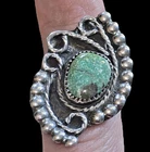 This is an incredible NAVAJO NATIVE AMERICAN find! It is an original NATIVE AMERICAN sized 5.5 BLACKHAWK signed and made GREEN TURQUOISE freeformed STERLING SILVER RING! This ring features a bezel with a green blue turquoise stone in the center with 'bean pod' edges sterling silver! It is signed with BLACKHAWK & BLACK HILLS on the back of the ring to show authenticity! This ring is in pre-owned condition and would be considered GREAT condition! There are no scratches or missing work! HOWEVER, it could be cleaned but I do know some people perfer it not to be so I did not clean it due to this. Other than that this ring is Great! This ring is perfect for the NATIVE AMERICAN JEWELRY lovers! Or someone who collects NAVAJO jewelry from the early 1900s that is also signed!! Very RARE SOUGHT after piece of art!!
