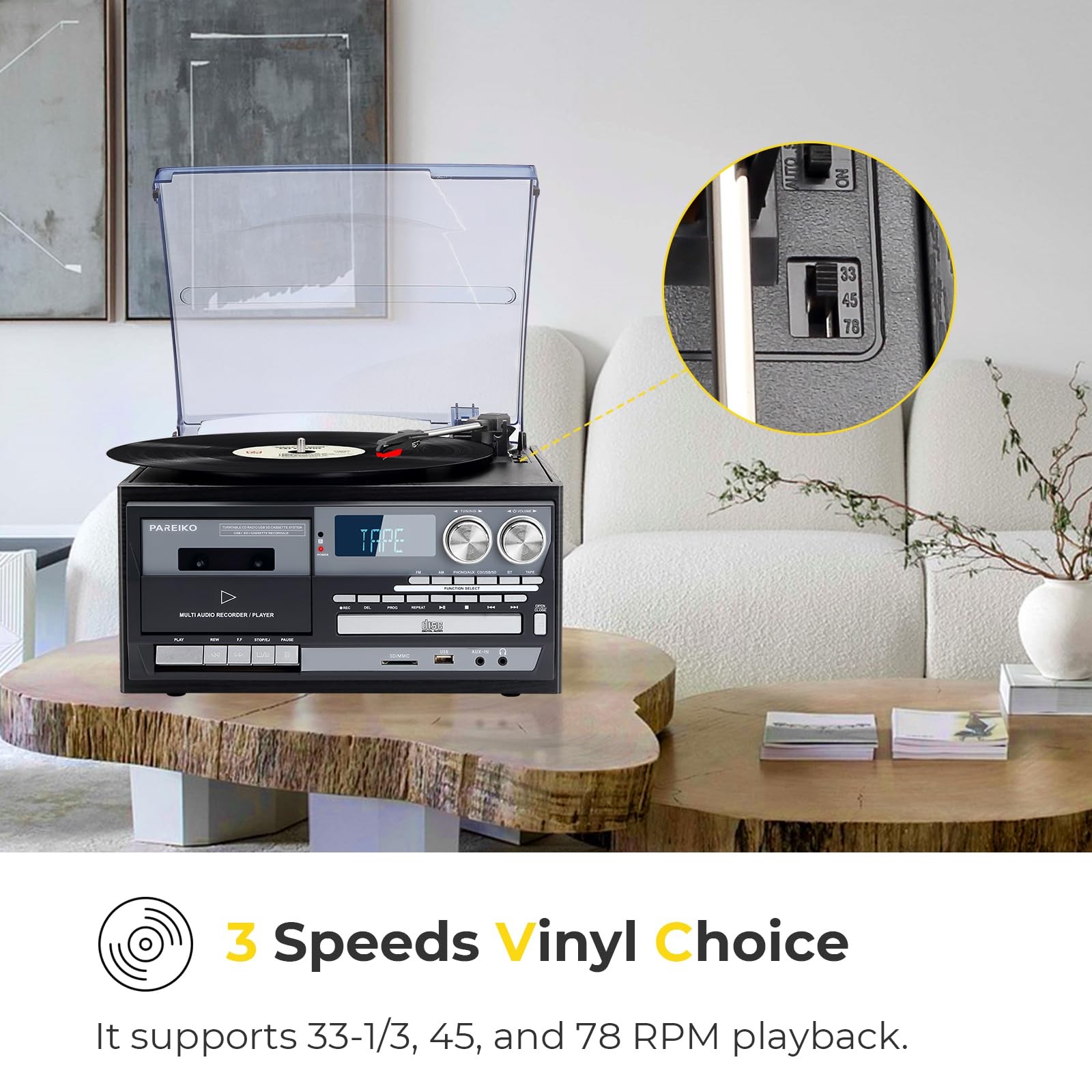 Bring the charm of classic audio systems into your home with the Vintage 9-in-1 Bluetooth Turntable, a truly versatile audio solution for vinyl lovers and music enthusiasts. This all-in-one system offers everything you need to enjoy your music collection, from vinyl records to digital files, in one beautifully designed unit. With a 3-speed turntable supporting 33 1/3, 45, and 78 RPM records, this turntable offers the perfect way to rediscover the rich, warm tones of vinyl. Whether you're revisiting your favorite album or enjoying the sounds of a new discovery, the turntable ensures a genuine vinyl experience. Rekindle your love for vinyl with this turntable that supports 33 1/3, 45, and 78 RPM records. Whether it’s an old favorite or a newly discovered gem, the warm, full sound of vinyl takes you back to a time when music had depth and soul. Perfect for collectors and newcomers alike. Rekindle your love for vinyl with this turntable that supports 33 1/3, 45, and 78 RPM records. Whether it’s an old favorite or a newly discovered gem, the warm, full sound of vinyl takes you back to a time when music had depth and soul. Perfect for collectors and newcomers alike. Rekindle your love for vinyl with this turntable that supports 33 1/3, 45, and 78 RPM records. Whether it’s an old favorite or a newly discovered gem, the warm, full sound of vinyl takes you back to a time when music had depth and soul. Perfect for collectors and newcomers alike. Rekindle your love for vinyl with this turntable that supports 33 1/3, 45, and 78 RPM records. Whether it’s an old favorite or a newly discovered gem, the warm, full sound of vinyl takes you back to a time when music had depth and soul. Perfect for collectors and newcomers alike. Take charge of your music with the included remote control. Adjust volume, skip tracks, and switch between modes—all from the comfort of your seat. The remote makes it easy to navigate your music without getting up.