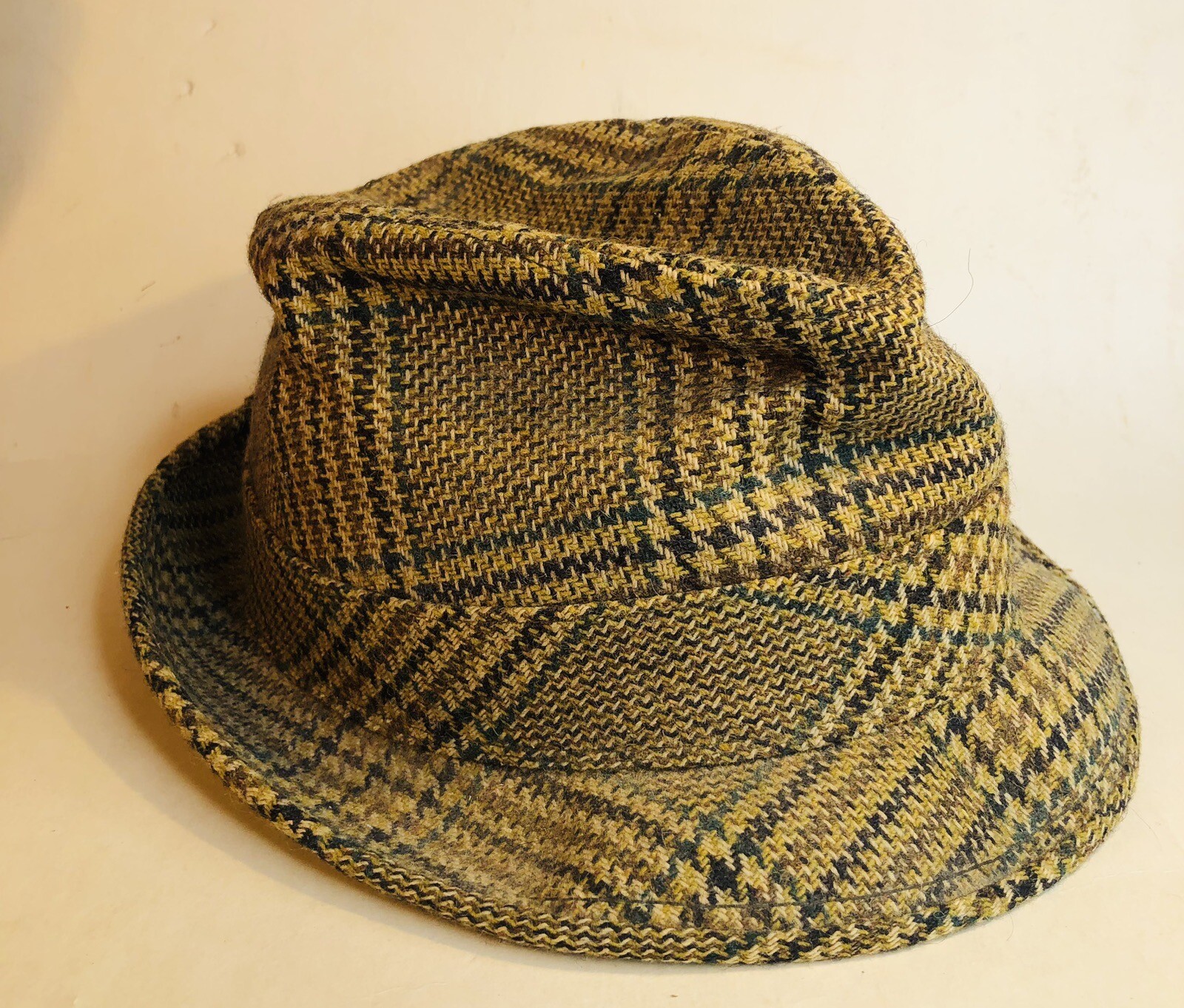 Vintage Men’s Adams New York Fedora. Size 7 1/8. Tweed Wool with Feather. Does have some misshaping on brim and top. Still wearable though. No rips, tears or stains to material. Inside lining is intact.