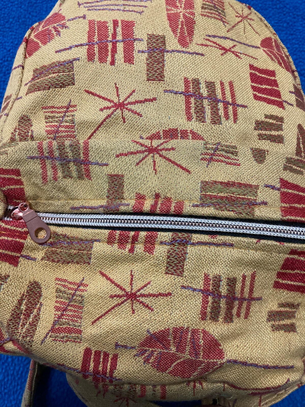 UNISEX BACK PACK HAND SEWN BRAND NEW MEASURES 10X8 ADJUSTABLE STRAPS, HANGING HOOK ZIPPERED POUCH IN FRONT SIDE POCKETS THIS WAS MADE FROM VINTAGE SOFA MATERIAL THANKS FOR LOOKING