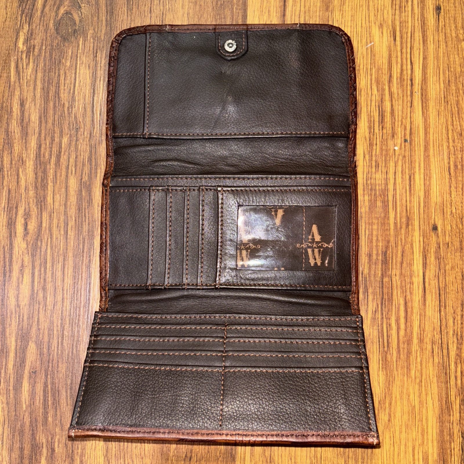 This wallet is designed for women and is a replica of American West brand, featuring a tri-fold style with a Western theme. It is made of brown leather like material with studded accents, giving it a rugged and stylish look. The wallet has a folding design and measures 7 1/4 inches in length and 4 1/4 inches in height, making it spacious enough to hold all your essentials. Ideal for those who appreciate quality craftsmanship and Western-inspired accessories. Appears to have been used minimally.