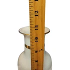 Adorn your space with this exquisite porcelain vase, a testament to timeless artistry. Its pristine white glaze is elegantly accented with shimmering gold trim, drawing the eye to the captivating centerpiece on its body. A circular medallion showcases a vibrant, meticulously detailed floral arrangement, complete with a charming traditional cart, rendered in rich, metallic hues. The flared opening and tapered base create a graceful silhouette, promising to elevate any decor. Perfect for gracing a mantelpiece, as a striking centerpiece for a formal dining table, or as a sophisticated accent in a sunroom. Measurements: • Height: 11.5 in • Opening Diameter: 3.75 in Type: Flower Vase Material: Ceramic Shape: Bottle Theme: Art Style: Asian Department: Adults Features: Decorative Pattern: Floral Room: Living Room, Any Room Mounting: Free Standing Care Instructions: Clean with Warm Water Unit Type: Unit There is some wear of gold framing around art. Keywords: porcelain vase, vintage decor, gold accent, floral design, ornate vase, table centerpiece, mantel decor, decorative vase, asian inspired, elegant home, classic style, gift idea, collectible vase