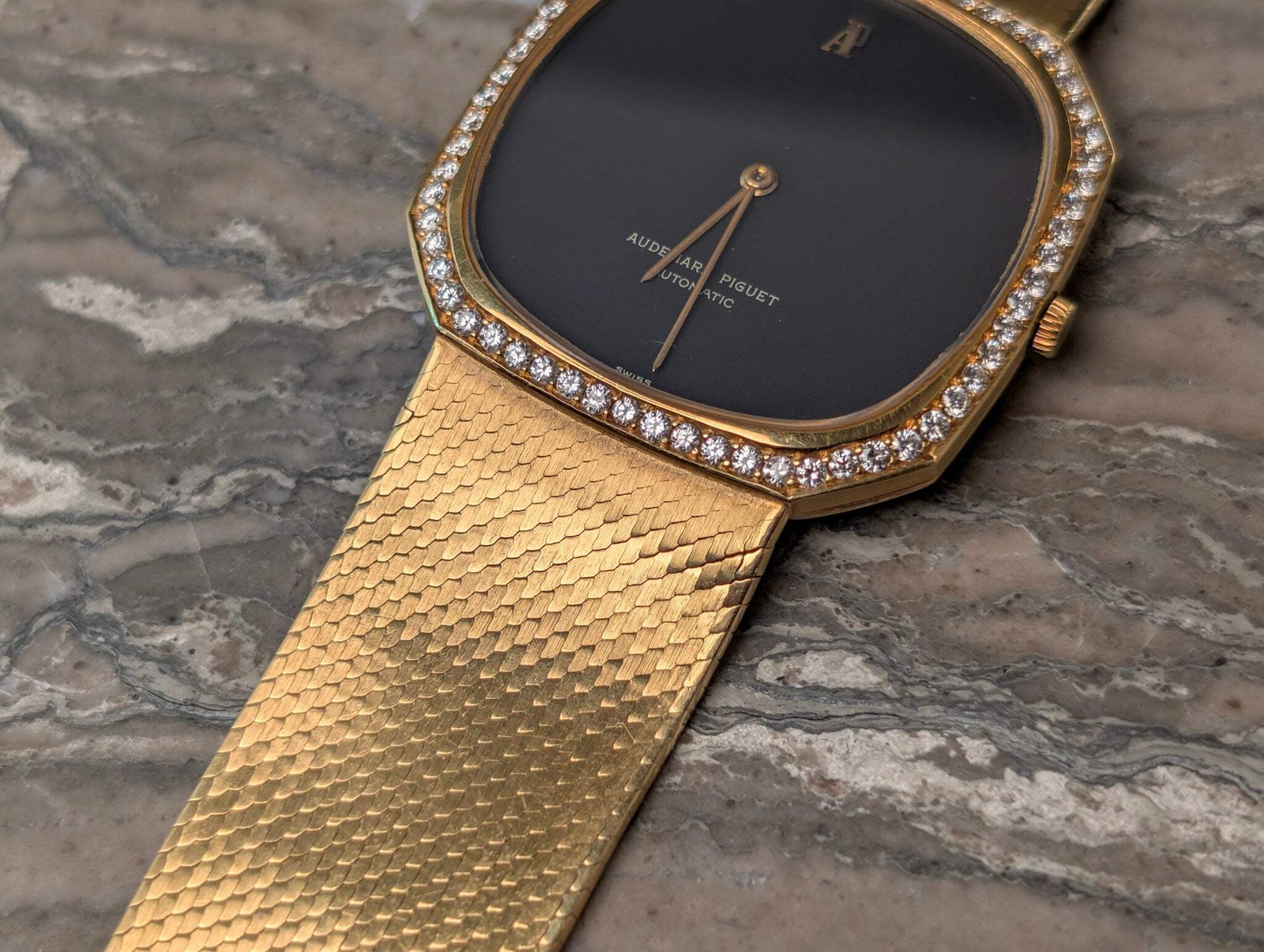 Vintage Audemars Piguet Diamond Set 18k Yellow Gold Octagonal Watch 5471 Rare This Audemars Piguet Ref. 5471 is a striking and seldom-seen dress watch, crafted in solid 18k yellow gold and adorned with a diamond-set bezel and lugs. Measuring 35mm in diameter, the case maintains the elegant, ultra-thin proportions of AP’s classic era while offering a confident presence on the wrist. At its core is the legendary Caliber 2120—an ultra-thin automatic movement known for its precision and refined engineering. The watch features a deep black dial, highly prized for its natural luster and minimalism, accented by applied gold hour markers and dauphine hands. Completing the watch is an integrated 18k yellow gold mesh bracelet that drapes smoothly on the wrist and elevates the overall aesthetic to one of timeless sophistication. A rare combination of mechanical pedigree, precious materials, and vintage elegance, this piece is a standout example of Audemars Piguet’s mid-century craftsmanship. Condition Report: Watch Only, in really nice condition, some minor signs of wear including superficial scratches on the buckle as well as light scratches on the dial. Vintage Audemars Piguet Diamond Set 18k Yellow Gold Octagonal Watch 5471 Rare This Audemars Piguet Ref. 5471 is a striking and seldom-seen dress watch, crafted in solid 18k yellow gold and adorned with a diamond-set bezel and lugs. Measuring 35mm in diameter, the case maintains the elegant, ultra-thin proportions of AP’s classic era while offering a confident presence on the wrist. At its core is the legendary Caliber 2120—an ultra-thin automatic movement known for its precision and refined engineering. The watch features a deep black dial, highly prized for its natural luster and minimalism, accented by applied gold hour markers and dauphine hands. Completing the watch is an integrated 18k yellow gold mesh bracelet that drapes smoothly on the wrist and elevates the overall aesthetic to one of timeless sophistication. A rare combination of mechanical pedigree, precious materials, and vintage elegance, this piece is a standout example of Audemars Piguet’s mid-century craftsmanship. Condition Report: Watch Only, in really nice condition, some minor signs of wear including superficial scratches on the buckle as well as light scratches on the dial. × × × × × × × × × × Buy now and save! Shipping info Click the Shipping & Payments tab above the listing description for more info Click the Shipping & Payments tab above the listing description for more info! Additional delivery notes PICK UP OPTION Sorry, our items are NOT available for pick-up. PAYMENT Immediate payment is required upon selecting "Buy It Now" or upon checking out through the cart. We accept payment via U.S. PayPal accounts and all Major Credit Cards, Debit Cards & Google Pay. We are legally required to collect sales tax in those states and localities where we maintain a physical presence (nexus). The applicable amount of sales tax charged to an order will be calculated based on the shipment destination's state and local sales tax laws. Thank you for shopping with us on eBay! Additional Information No additional information at this time Ask seller a question You might also like Rolex Sky-Dweller Unworn 42mm Box & Papers Rose gold Chocolate Dial Oyster-Flex Rolex OP 31 UAE Armed Forces signed Oyster Perpetual Box&Papers Pink markers Vacheron Constantin 1954 Cioccolatone Toledo Ref 4822 Rare Watch Box and Paper Rolex Datejust 36mm Rare Arabic Motif Dial Two Tone Ref: 16013 Jubilee Bracelet Contact To contact our Customer Service Team, simply click the button here and our Customer Service team will be happy to assist. Ask seller a question © Watch Them Tick Shipping & Payments Click the Shipping & Payments tab above the listing description for more info Payment Accepted Payment Methods Immediate payment is required upon selecting "Buy It Now" or upon checking out through the cart. We accept payment via U.S. PayPal accounts and all Major Credit Cards, Debit Cards & Google Pay. We are legally required to collect sales tax in those states and localities where we maintain a physical presence (nexus). The applicable amount of sales tax charged to an order will be calculated based on the shipment destination's state and local sales tax laws. Thank you for shopping with us on eBay! Returns Returns are accepted Items must be returned within 14 days of the auction ending Buyer will pay for return shipping. eBay integration by
