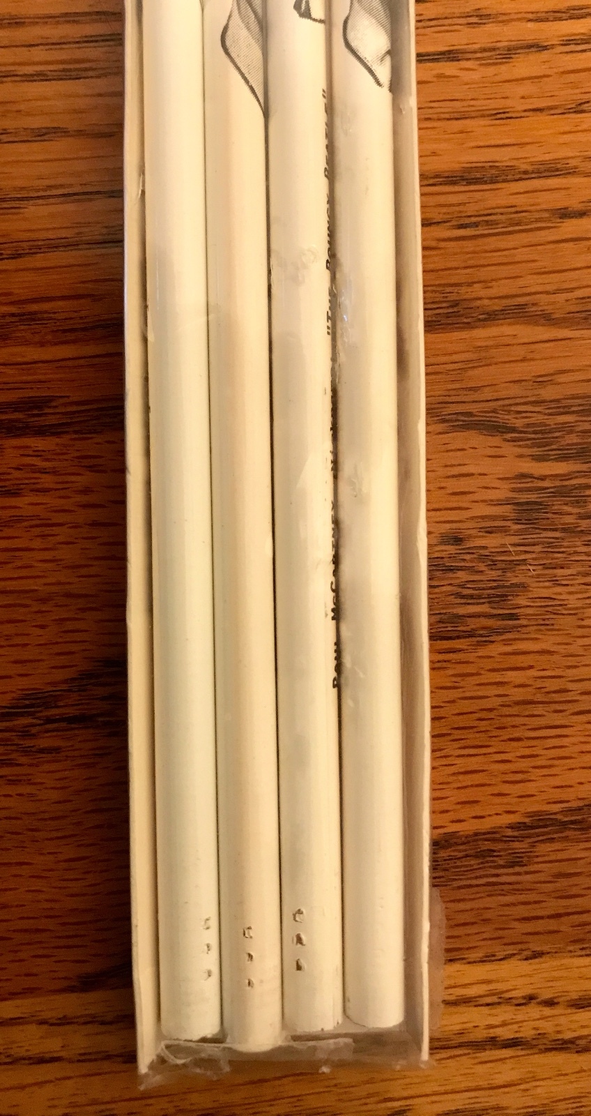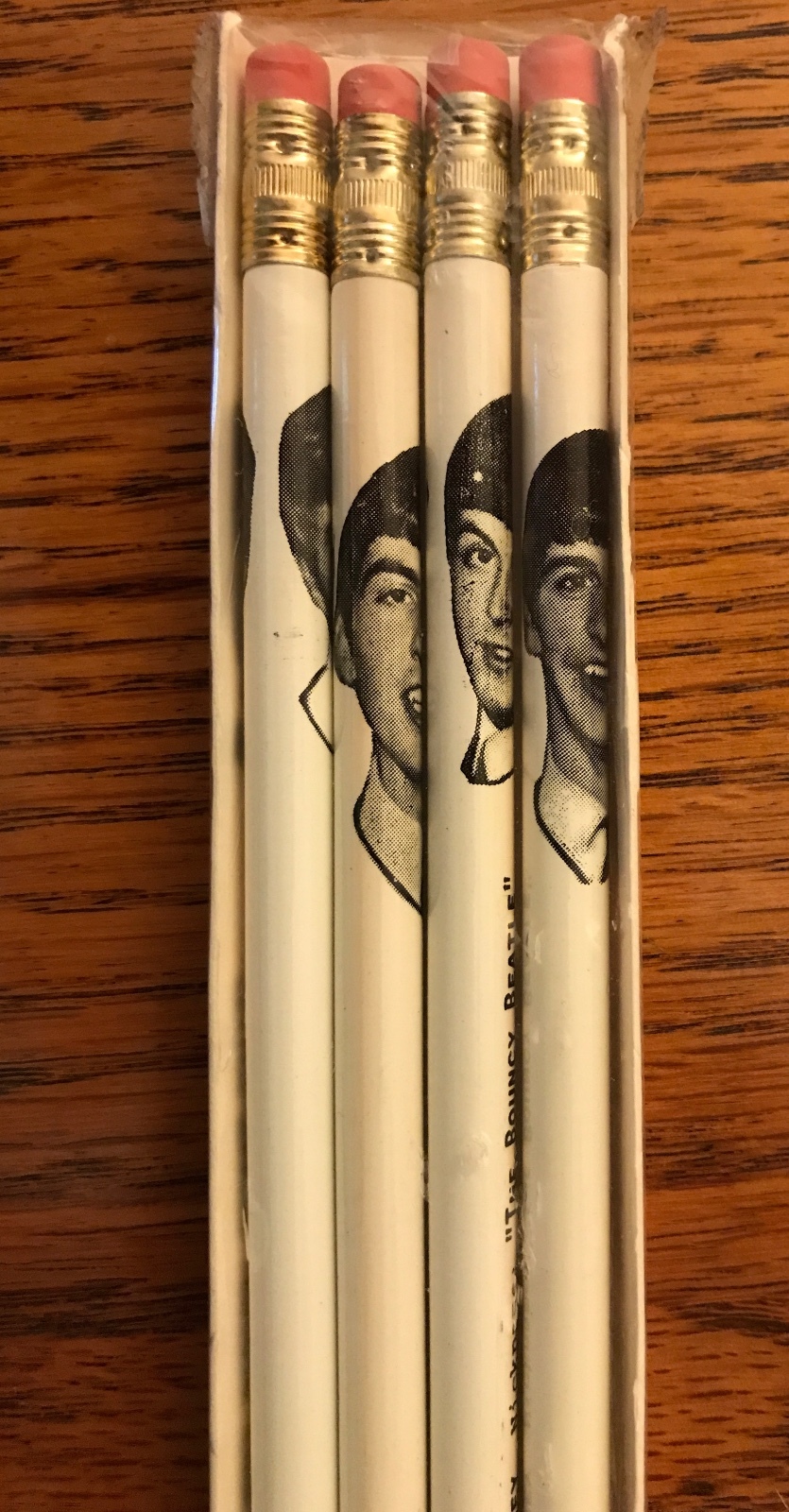 This listing is for a Beatles Set of 4 Pencils still sealed in the package. Each pencil has a picture of one of the Beatles. It says their nickname, birthday, and the instrument they play. The pencils are white and the pictures and lettering are in black and white. They are in near mint condition. They come from my own personal collection. This is the only set I have to sell. FREE PRIORITY INSURED SHIPPING! NOTE - THIS PACKAGE OF PENCILS IS STILL SEALED ~ NO RETURNS ACCEPTED! PLEASE SEE THE MANY OTHER GREAT ITEMS I HAVE IN MY STORE!