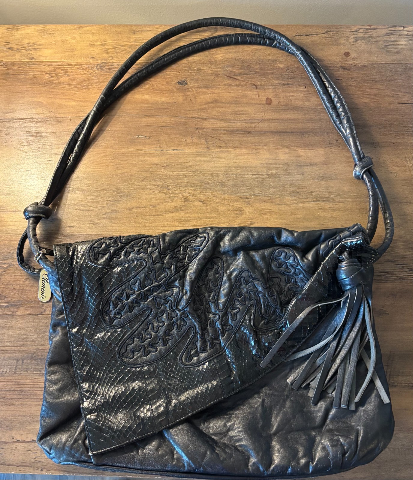 Vintage Clemente black leather shoulder bag featuring a soft, slouchy hobo silhouette with a stylish tassel detail. This bag has a great Y2K look and is perfect for everyday use or adding a trendy vintage touch to any outfit. Details: Brand: Clemente Color: Black Material: Leather (appears genuine) Style: Hobo / Shoulder Bag Closure: Zipper Features: Tassel accent, textured flap detail Measurements (approx): Width: 13.5" Height: 9.5" Base: 12" Strap drop: 13" Condition: Good pre-owned condition with light wear consistent with age. Minor creasing and surface wear to leather. Interior is clean. No major flaws. Please review all photos for details. “Open to reasonable offers – fast shipping!”