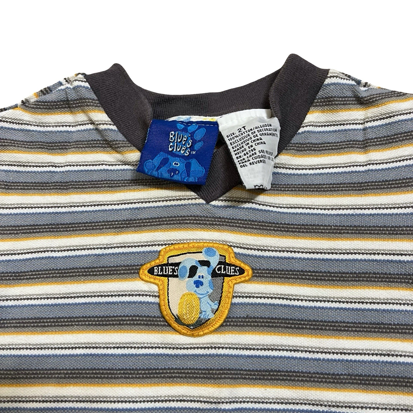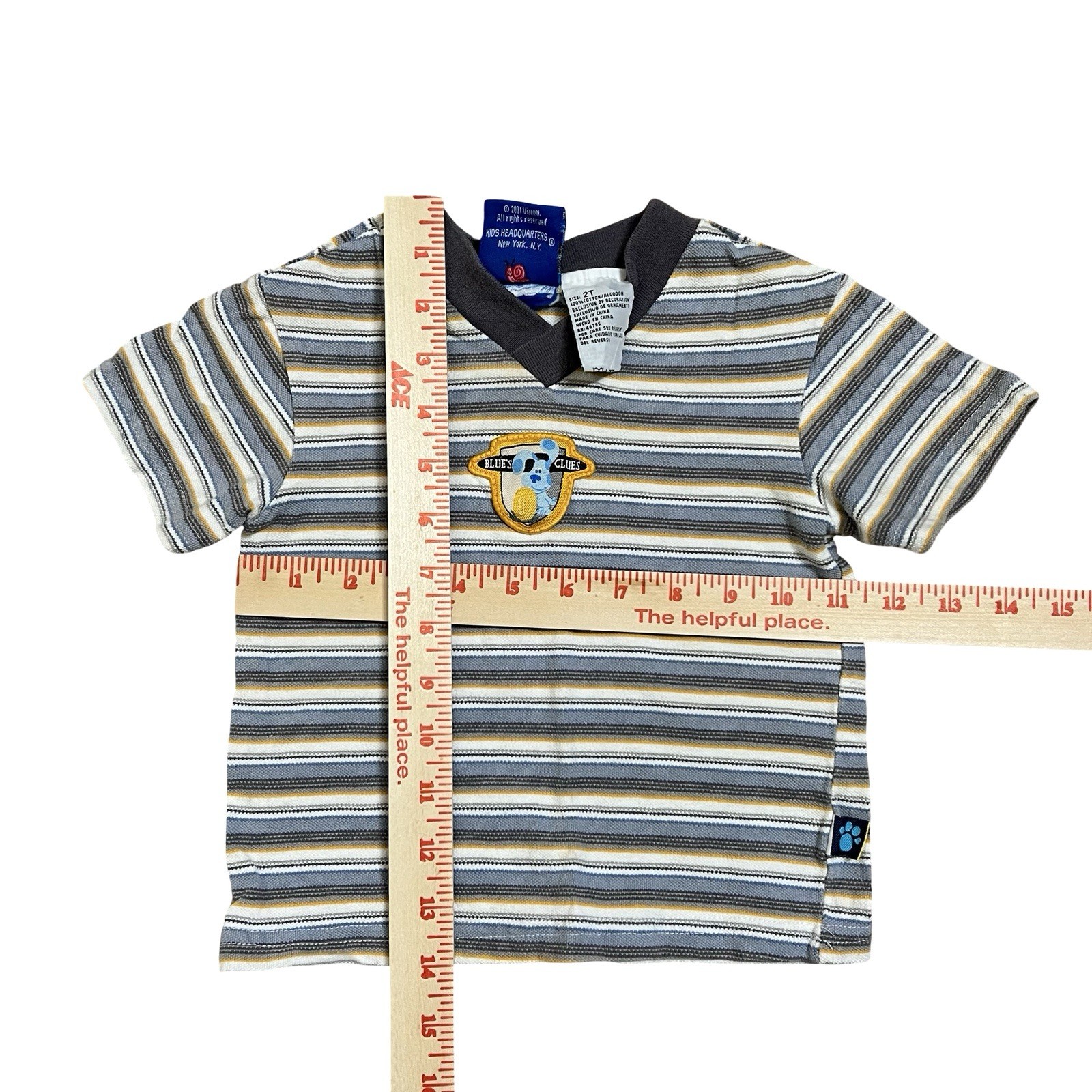 Brand: Blues Clues, officially licensed Blue's Clues apparel by Kids Headquarters. Size: Boys 2T (toddler) per neck tag. Color: Multicolor horizontal stripes in gray, white, light blue, and yellow with a dark charcoal ribbed collar. Material: 100% cotton knit body exclusive of decoration per fabric tag. Style: Vintage boys short sleeve crew neck T-shirt with regular fit and classic striped pattern. Details: Embroidered Blue's Clues shield patch at chest featuring Blue the dog, small woven paw logo tab at hem, contrast ribbed neckline, straight hem, and soft all-season cotton jersey fabric. Brand markings: Blue's Clues character neck label, Kids Headquarters New York N.Y. licensing tag with 2001 Viacom copyright, inner care and content tag with RN 46725. Country of origin: Made in China. Condition: Pre-owned shirt in clean shape with light wash wear to cotton knit and a small loose thread at one hem seam; fabric, embroidery, and seams intact with no stains, holes, or tears.