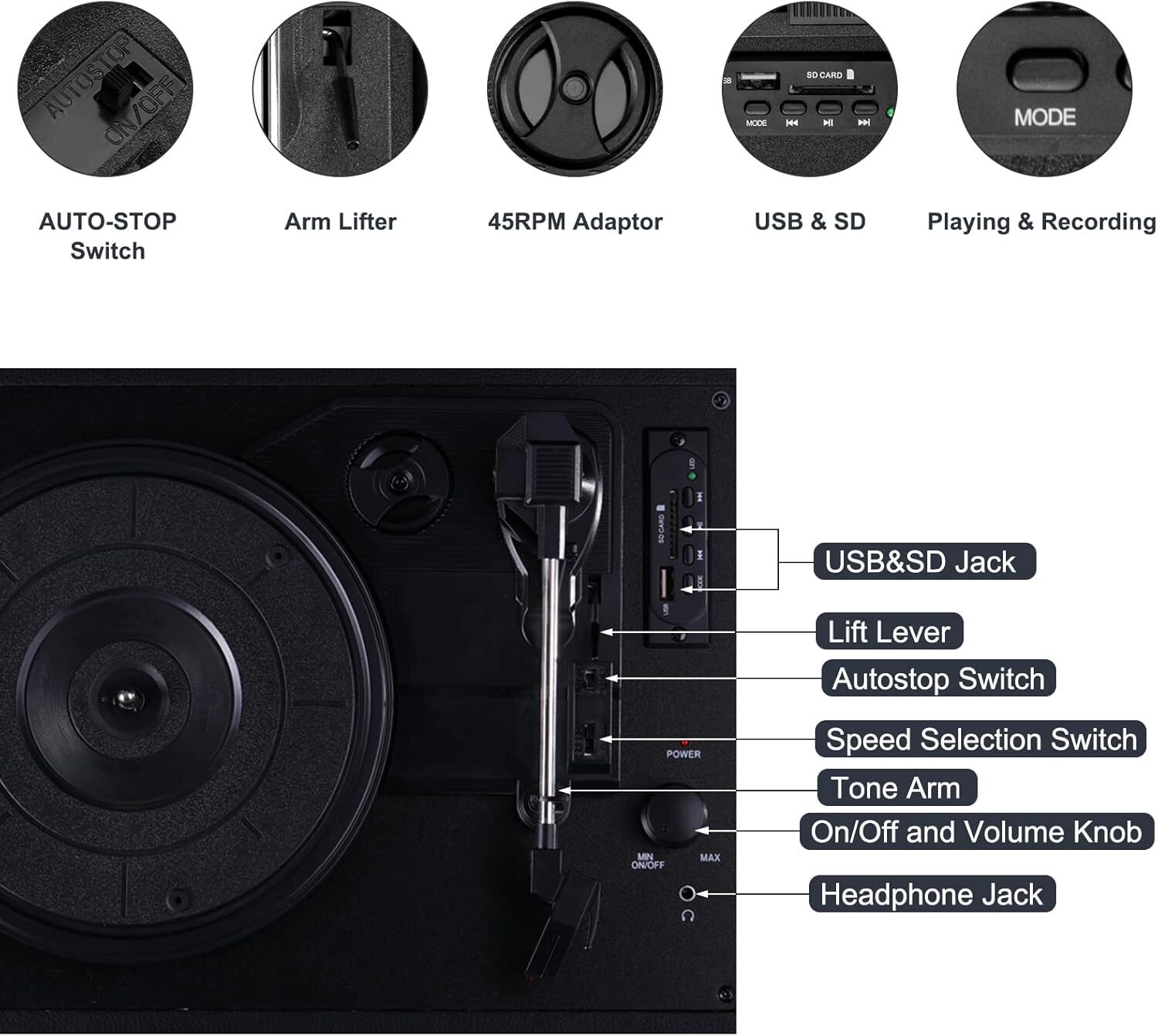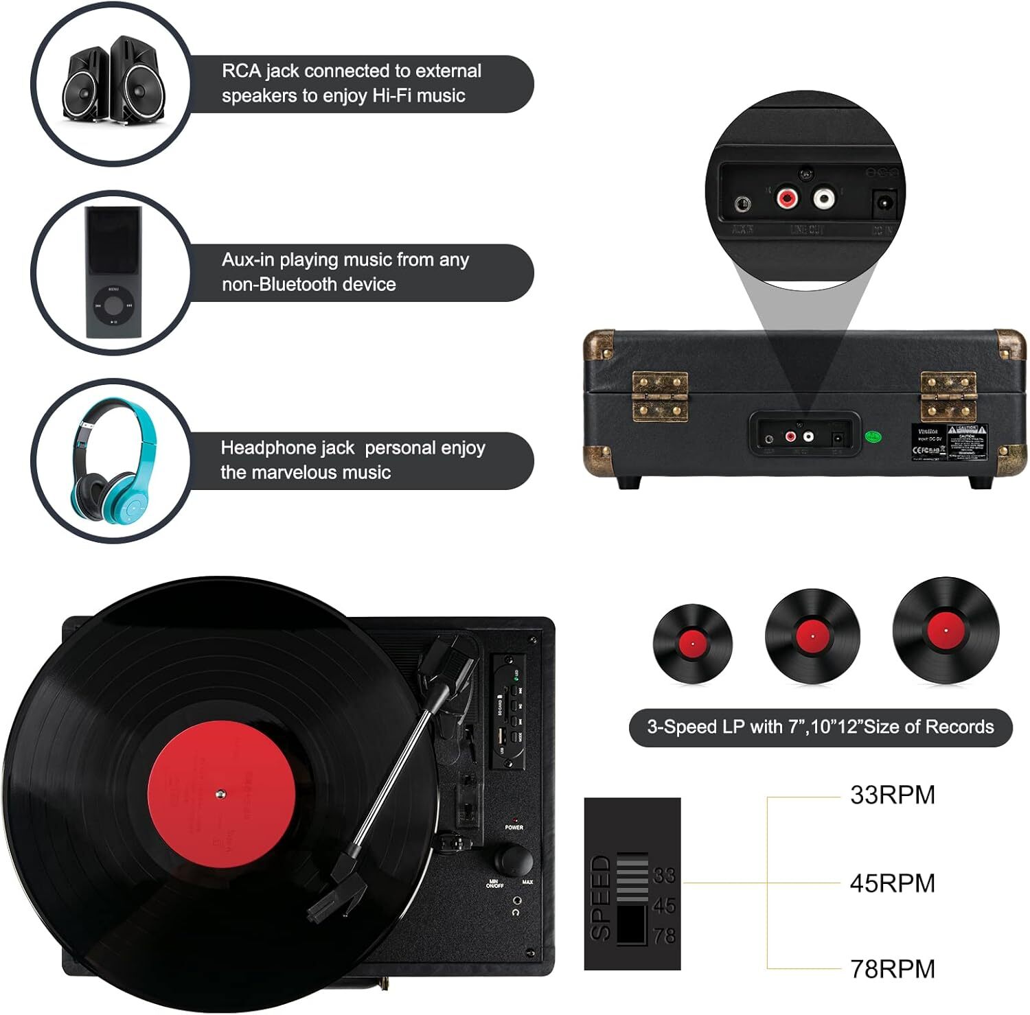 Record Player for Vinyl with Built-in Speakers Bluetooth Output,3 Speed Belt-Driven Phonograph Retro Turntable Player, Portable Vintage Suitcase LP Player USB Recording, Includes 2 Extra Stylus Item Description About this item 【Bluetooth output and In】Record players for vinyl with speakers. Bluetooth receiver enable you can stream your mobile music through the built in speaker. While Bluetooth output can enjoy your LP collection via your external Bluetooth speakers. Wireless connection release you from the messy cables. When you use Bluetooth to transmit, just tap the mode key and wait about 10s 【Vinilos turntables for vinyl records】USB &SD jack for playing and recording LP music by flash disk & Micro SD card. Headphone jack for Private listening.Connecting with external home HI-FI system via RCA cable. 33 45 78 RPM play all your 7" 10" 12" vinyl records collection . 2 free replacement stylus make this retro turntable more durable. 【Excellent sound quality and exterior 】Built in 2X3W dynamic speakers covered with EVA mat that prevent vibration, retro bronze hardware and speaker grill. Suitcase design make it easy to be carried to anywhere,when family gathering, Friends party & Private time, relax you anytime you like. It’s a fantastic festival gift like Christmas,etc. 【Portable easy to use】Auto stop switch can stop turntable automatically once the vinyl content is finished.Clean only with a dry cloth and Brush.Combination of retro and fashion, it’s a perfect decoration for your living room, bedroom or office. It’s a great choice for vinyl enthusiast. 【Package and service】2 Spare Diamond Stylus Needles, 1 Record Player, 1 Power Adapter, 1 User Manual. You could consult us by email if you have any questions about our product and service. We guarantee to reply you within 24 hours. Playing classic Vinyl with the retro record player,taking you back to the slow time and let marvelous music streaming in your Leisure life. Retro will never be fade, nostalgia is a manner.Smooth PU leather, retro bronze hardware and speaker grill, not only bring you the joyful music, but also an exquisite decoration in your house. Built in 2X3W dynamic speakers covered with EVA mat that prevent vibration,has much better bass effect than most of the similar products on the market. Bluetooth output and input. Wireless connection release you from the messy cables. The high sensitive ruby needle could pick-up the records signal precisely and create amazing music which you have been looking forward to. USB disk/SD card recording and music playback.Bluetooth,AUX-in and RCA output. In all directions and multiple choices to enjoy wonderful music Exquisite and compact, easy to carry. Whether you put it in the living room, bed room or office, relax you anytime you want. Since 2009, as the professional manufacturer with much efficient management principle, we have been supplying the high quality record players all over the world. Our aim is to lead the LP&Vinyl Culture to a unique trend in modern society,while it’s filled with the mobile music in MP3 format. Wish all vinyl enthusiast own their fantastic vinyl record players like their soul mate. 1.When listening to a record. Please take off the protective plastic cover over the needle, and open the tone arm clip to release the tone arm before you put it on a record. 2.There is a gentle one touch lever (Arm Raise Lever) that can raise the tone arm above the record and slowly lower the needle onto the record. 3.When playing a 45 rpm record, use the included 45rpm adapter and located in the holder near the tone arm. Payment Fast and Free Shipping Shipping safe payment via eBay . Return 30 Day's returns