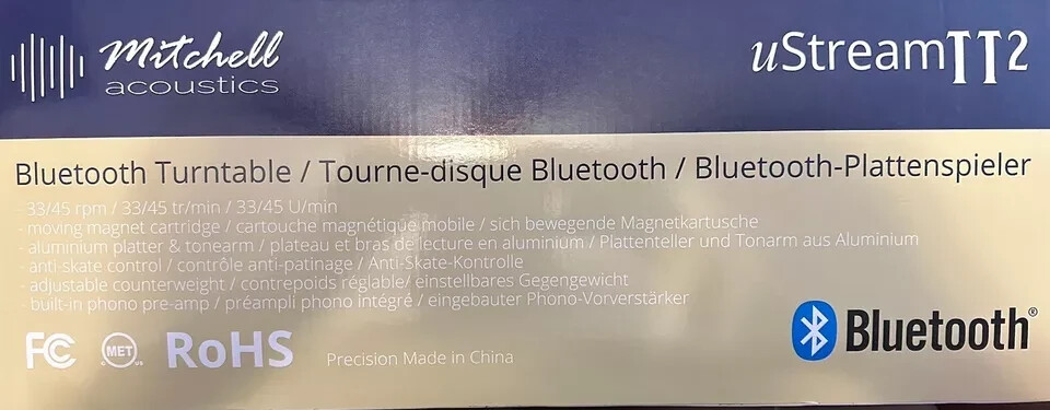 THIS ITEM WAS UNOPEN I OPEN IT TO CHECK IT. EVERYTHING WAS GOOD AND BRAND NEW Belt Drive USB/Bluetooth Turntable 33 1/3 and 45 rpm with Auto-Stop Aluminium tone arm & platter Real Wood Veneer Mitchell Acoustics high-end moving magnet cartridge USB recording & built-in PHONO pre-amp Anti-interference coupling circuit Top Panel Controls Speed Rotary Selector (33 1/3 rpm – 45 rpm) Bluetooth Pairing Touch Control Rear Panel Controls Slide Switch for Pre-amplifier On/OFF selection for RCA jack output Plinth Real wood veneer (Oak or Black Ash) Platter & Tonearm Aluminum alloy with anti-skate adjustment and adjustable counter-weight for tonearm Drive Transmission Belt drive with auto rotation speed checking and correctionz-20KHz Pick Up Audio Technica AT91 moving magnet cartrdige Wireless Connectivity Bluetooth A2DP wireless connection; Bluetooth V5.1; Bluetooth Supports: HFP, A2DP, AVRCP profiles; Bluetooth scope: 10meters or 33 feet Connectivity Analog via RCA Left and Right USB via USB cable USB to PC recording for vinyl record Audacity Software for PC recording included Equalization Built-in RIAA equalizer Power AC110-220V,50/60HZ,13W Origin China Accessories AC power cord, spindle adaptor Dimensions (W x D x H) 440mm (17 5/16 ”) x 380mm (14 15/16 ”) x 135mm (5 5/16 ”) Box: 535mm (21 1/16 ”) x 456mm (17 15/16 ”) x 190mm (7 1/2 ”) Weight 6.2kg (Gross box weight 6.9kg) 13lb 11oz (Gross box weight 15lb 4oz)
