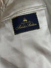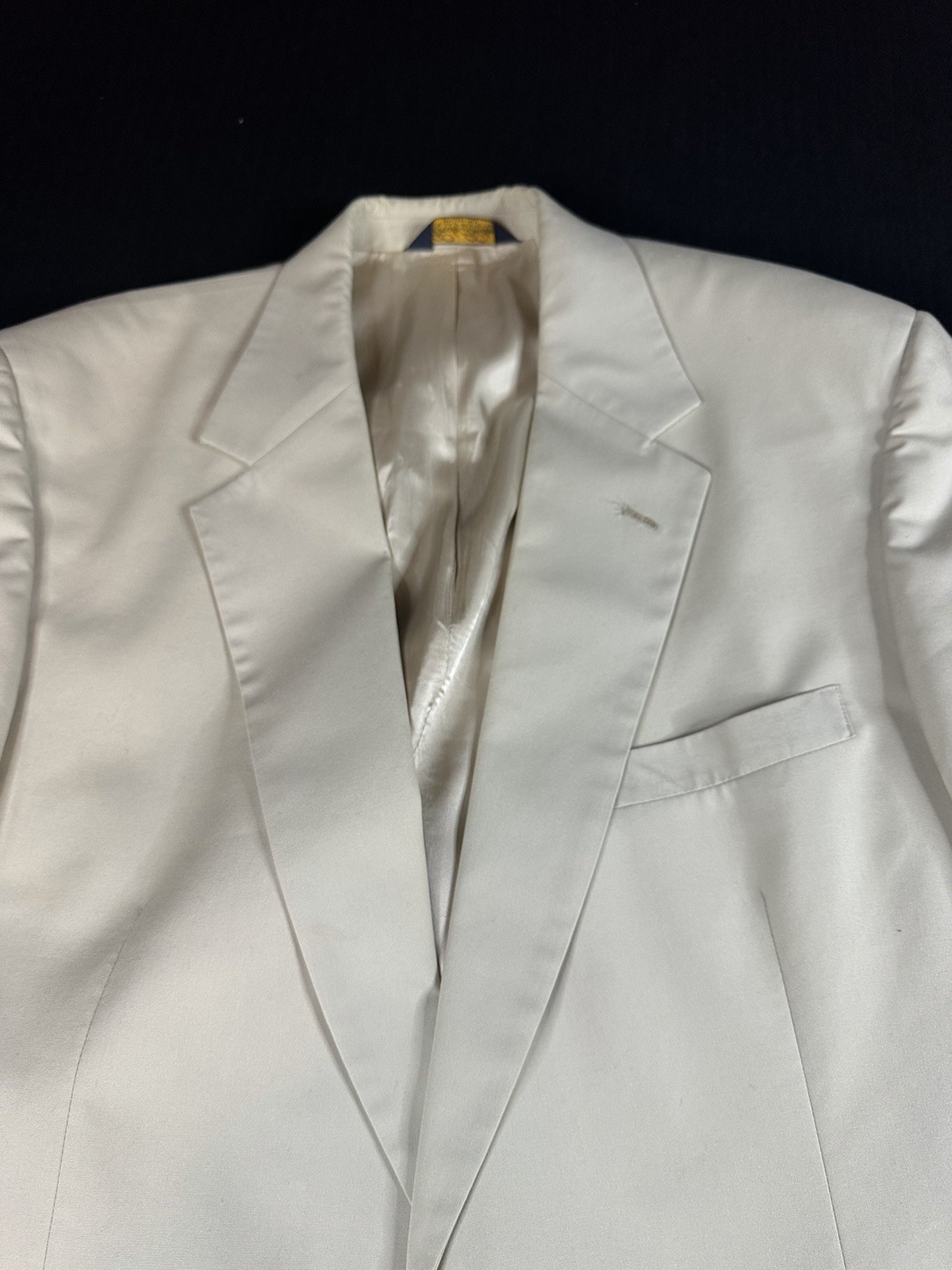 Classic vintage Brooks Brothers two-piece suit set in a timeless cream / ivory tone, featuring a tailored blazer and matching trousers. Brooks Brothers, established in 1818, is known for refined American tailoring and high-quality formalwear. The blazer features notch lapels, front flap pockets, a chest pocket, and button cuffs, while the trousers offer a clean tailored cut with pleated front and belt loops. This sophisticated suit is perfect for formal events, weddings, summer occasions, or collectors of classic menswear. Details β’ Brand: Brooks Brothers β’ Established: 1818 β’ Made in U.S.A. of Imported Fabric β’ Color: Cream / Ivory β’ Set Includes: Blazer + Pants β’ Style: Classic tailored suit β’ Closure: Two-button blazer β’ Pants: Pleated front, zip fly, belt loops Approximate Measurements Jacket β’ Length: ~30 in β’ Pit to pit: ~23 in β’ Shoulder width: ~19 in β’ Sleeve length: ~25β26 in Pants β’ Waist: ~36 in β’ Inseam: ~30 in β’ Rise: ~12 in β’ Leg opening: ~9 in Condition Good vintage condition with light signs of wear. Small faint marks present on the fabric (shown in photos). Overall still a very sharp and classic suit. Keywords brooks brothers suit, vintage brooks brothers, cream suit set, mens vintage suit, classic menswear, formal vintage suit, vintage blazer pants set #BrooksBrothers #VintageSuit #ClassicMenswear #VintageBlazer #VintageStyle #MensVintage π» LaBelle Ady β Vintage Beauty, Reimagined π»
