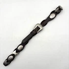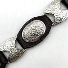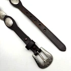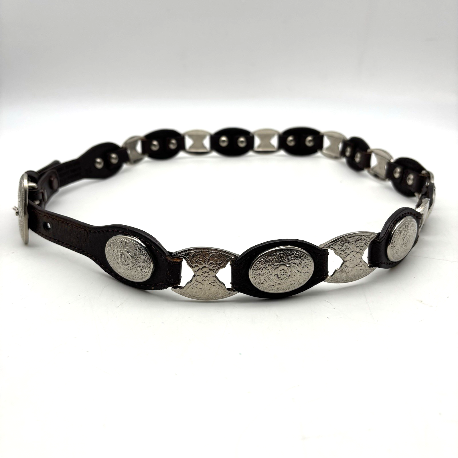 Vintage Women's Western Belt Style Code: 393402-210 Brown Genuine Leather 10 Oval Silver-tone Daisy Conchos 1 1/4" x 7/8" 9 Silver-tone Metal Segment Daisy Conchos 1 1/4" x 1" Removable Silver-tone Buckle Women's Size XL Refer to measurements below to ensure accurate fit before purchase! Buckle: 1 3/4" long 2 1/8" wide Belt Measurements: 1 1/4" wide at concho parts 3/4" wide at belt ends 41 1/4" full length from buckle prong to belt end 35" smallest hole 38" largest hole 5 holes total, approximately 3/4" apart Excellent vintage pre owned condition. Very gently owned, hardly worn. Clean and from a smoke free home.