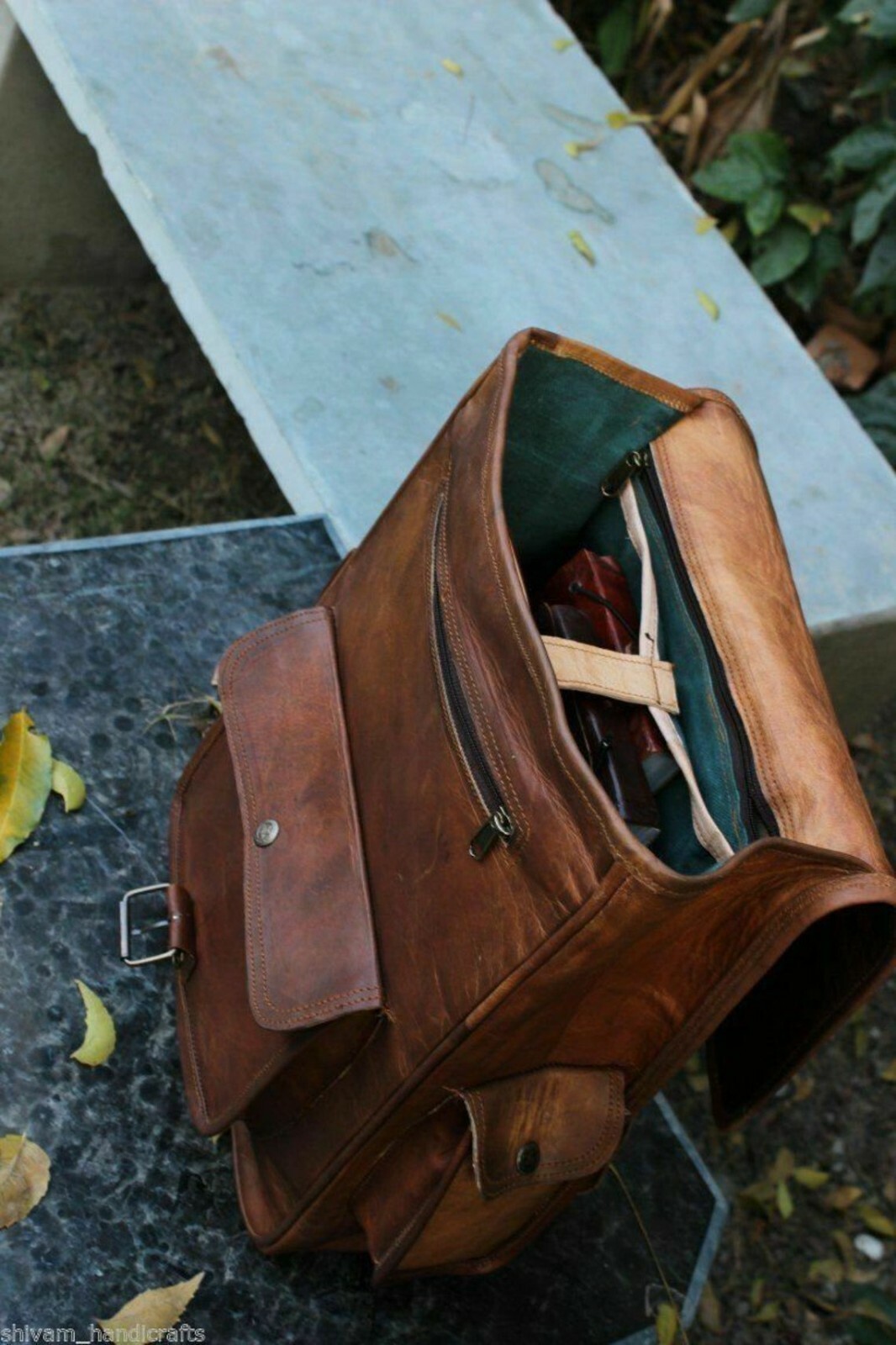 100% genuine goat leather messenger bag with a durable inner lining made of canvas. Designed to carry mini laptops, tab, documents or other personal belongings, etc. A genuine hand made product using chemical/dye-free leather. Natural oils and light have been used to obtain the style of the leather - chemical free! This bag features a wonderful unique and vintage look, designed to carry mini laptops, tab, documents, personal belongings etc. Perfect for the office, school or as a gift! Specifications: Made from 100% genuine, strong, lightweight, durable goat leather, tanned without the use of chemicals SIZE: 12 inch wide X 16 inch height Adjustable shoulder strap, roll close backpack with small front pocket. 2 big inner compartment for carrying files, mini laptop's, tab's etc with padding. 2 zipper compartments for important documents/paperwork etc. Inner canvas lining Vintage leather wash Leather softens and darkens with use Handmade in India by experienced crafts people