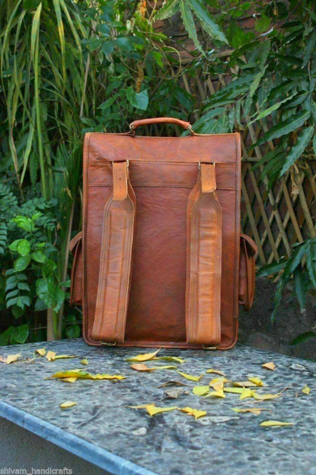 Features: Adjustable Strap, Audio Pocket, Bag Charm, Laptop Sleeve/Protection, Eco Friendly Vintage: Yes Handle Style: Shoulder Strap Closure: Buckle Material: Leather Lining Material: Canvas Bag Width: 12 in Color: Brown Department: Men Theme: Travel, College Style: Backpack Bag Height: 16 in Occasion: Travel Country/Region of Manufacture: India Brand: Handmade Bag Depth: 8 in Size: Large Hardware Material: Brass