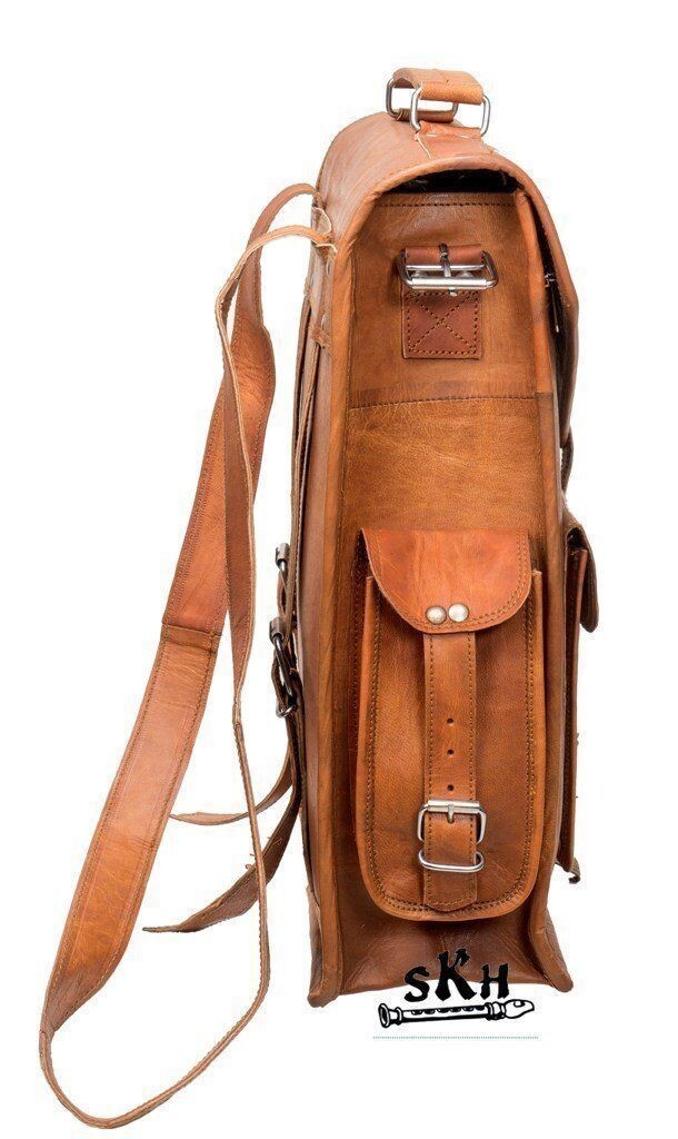 100% genuine goat leather messenger bag with a durable inner lining made of canvas. Designed to carry mini laptops, tab, documents or other personal belongings, etc. A genuine hand made product using chemical/dye-free leather. Natural oils and light have been used to obtain the style of the leather - chemical free! This bag features a wonderful unique and vintage look, designed to carry mini laptops, tab, documents, personal belongings etc. Perfect for the office, school or as a gift! Specifications: Made from 100% genuine, strong, lightweight, durable goat leather, tanned without the use of chemicals Adjustable shoulder strap, roll close backpack with small front pocket. 2 big inner compartment for carrying files, mini laptop's, tab's etc with padding. 2 zipper compartments for important documents/paperwork etc. Inner canvas lining Vintage leather wash Leather softens and darkens with use Handmade in India by experienced crafts people.