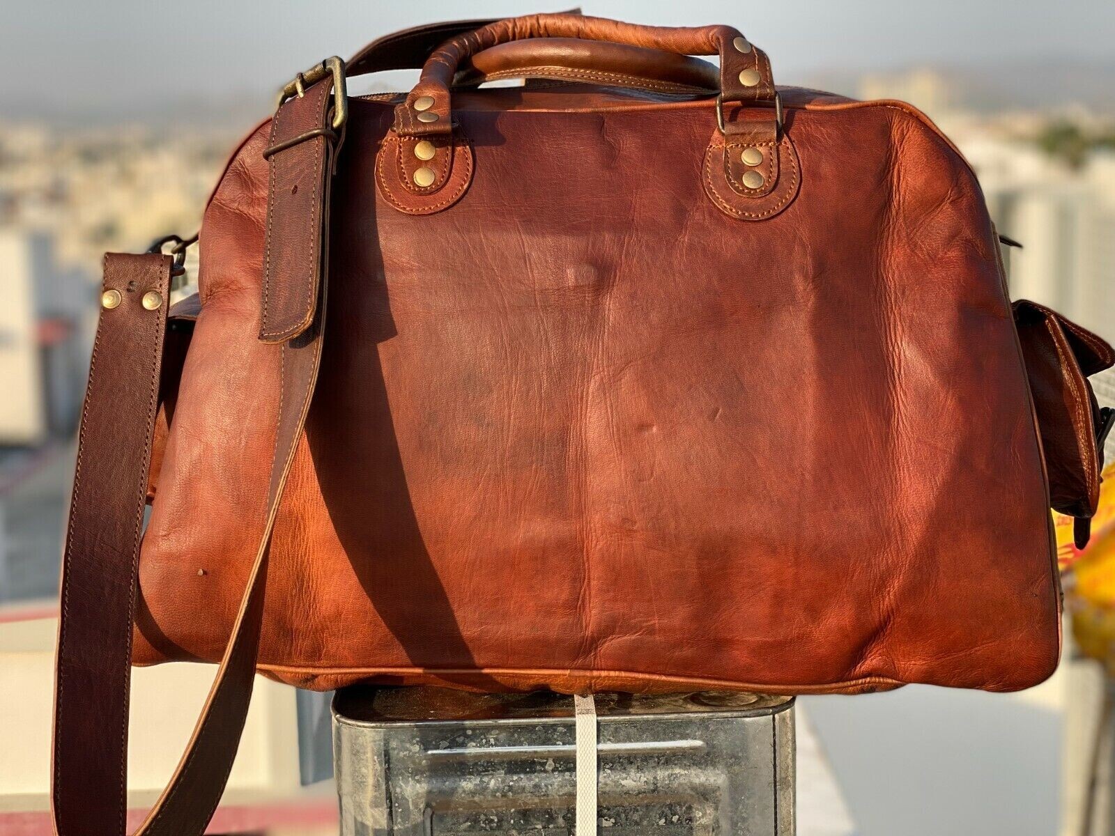 100% Genuine leather Products | Lining 100% Canvas I (MADE IN INDIA) Buy with confident 30 Days Return Policy Description Handmade Goat Leather Duffle,Travel & Gym Bag QUALITY LEATHER BAG Each bag is individually made using goat leather by experienced crafts people .The bag gets better and better with the time as the leather softens and deep-ens in color. The tonality color of each bag might vary in accordance with the low and high temperatures from the heart of The Thar desert.The leather does not receive any chemical treatment. On the bags a special vegetable oil is applied to give more tonality to the dominant brown (light and dark) color of the bag also making it more resistant to the water.Each bag has its charm and style and a very special earthy smell that will assure you it’s real leather.Its lightness, flexibility and durability will not make you regret your purchase. HANDMADE BRIEFCASE SATCHEL BAG FOR STUDENTS, OFFICE WORKERS AND COMMON PEOPLE Features Green canvas fabric Internal 1 large compartments 2 small pockets on front side of bag Thick adjustable strip SIZE: 16 (long) x 12 (wide) x 6 (deep) inches (See the picture for more detail) Strong, light-weight goat leather, tanned without the use of chemicals Leather softens and darkens with use Color and texture of the leather varies Natural real leather smell, just like a luxury car or lounge suite Solid brass buckles and fixtures - will last for years Has a wonderful natural look, and feel Each bag is uniquely individual due to slight color and marking variations on natural leather Brand New Handmade Leather Bag without tag Payment Using Paypal is the simplest and easiest way to pay, and is the way we prefer, but if you have a reason that you don't want to use Paypal that's OK, we will accept credit card payments and bank deposits, please contact us to arrange these after purchasing. we know that you will want to get your goods sent quickly so please remember to make your payment quickly after purchase, and we will dispatch within one business day after you have made your payment. if you need a bit of time to make your payment, that's also ok, please contact us to advise how long you need, we are happy to hold your goods for up to week before you pay. if you are purchasing from overseas,please be aware that we can only accept Paypal. Shipping Combine shipping (Heavy discounts) available Tracking details are available Express delivery (3 days) available on minimal extra charges, please write to us Shipping Partners - DHL, FedEx, UPS etc and like other International Courier Service providers only Shipping may be influenced by holidays, public events and/or any other uncertainties. We can not guarantee the exact arrival time.Please understand we could not control how the customs work at destination.If you are very care about the seemingly shipping time, please provide your contact numbers. We ensure to keep it confidential. Terms Of Sale Returns accepted Please write to us before returning the item Buyer should contact us within 20 days of receiving the item Refund will be given in refund or replacement on buyer's choice. Return shipping will be paid by the buyer Item must be returned in its original condition Please write to us for any clarification on RETURN POLICY About Us Namaste........ We are manufacturer and wholesaler of leather goods and specialized in Office Briefcases, Office Bag, College School bags, Travel Bag, Handbags, Purses, Wallets, leather journals and diaries and many more. We use quality leather of Goats and Camel. We offers customize designing and wholesale prices for bulk order. For more details, please write to us. Please visit our store and have a look of our other items If anything unanswered, please do write to us. Happy Shopping!! Please contact us via eBay with any questions you have about our products. We normally respond to any questions within one or two working days. Feedback & DSR If there is any problem with product or delivery, please contact us BEFORE leaving the feedback and below 5 star rating. 100% customer satisfaction is our goal. Your 5 Star rating will help us to reduce cost in your next purchase supreme