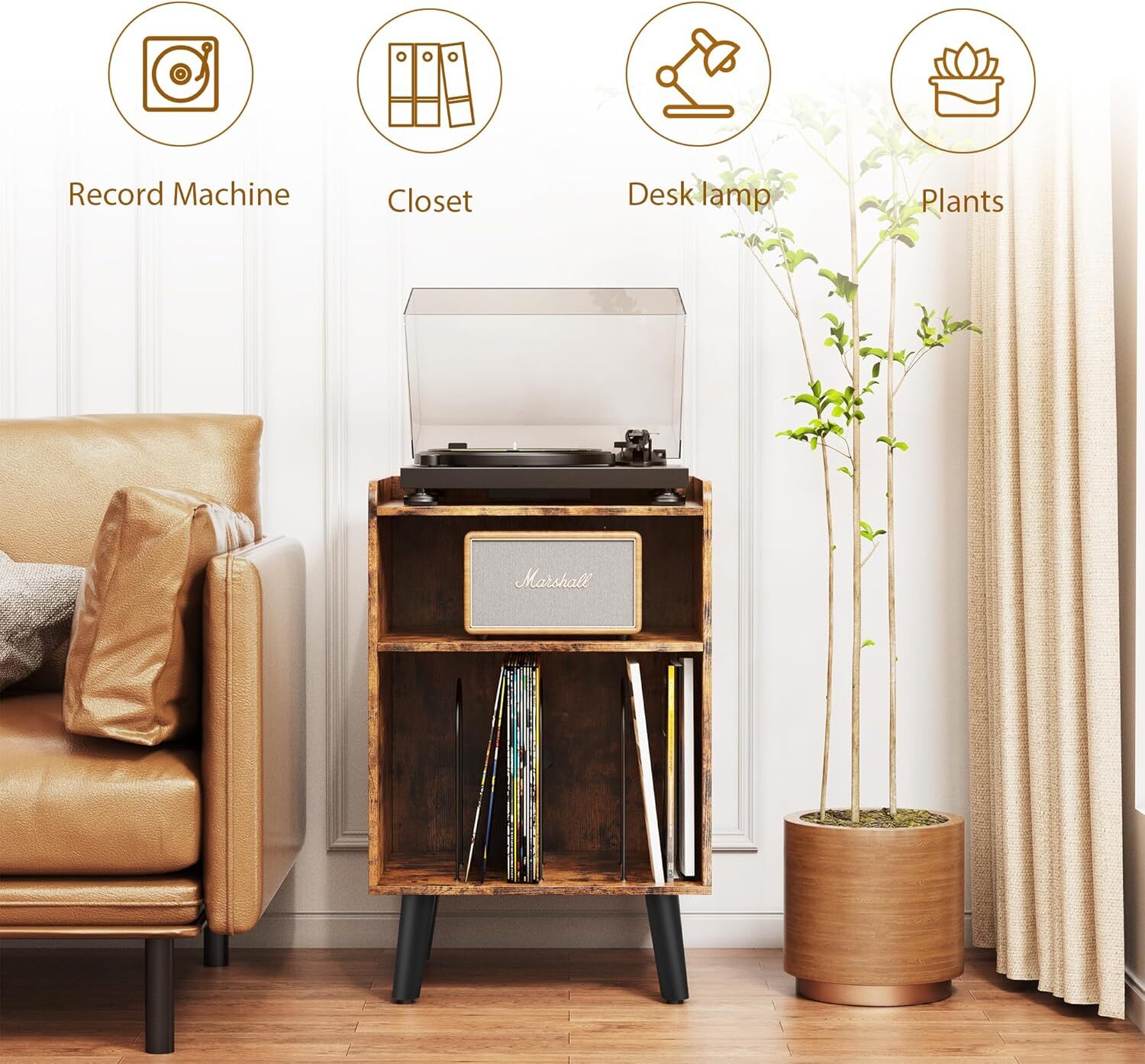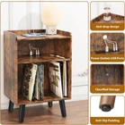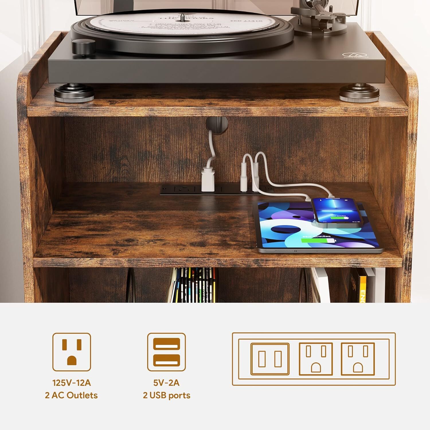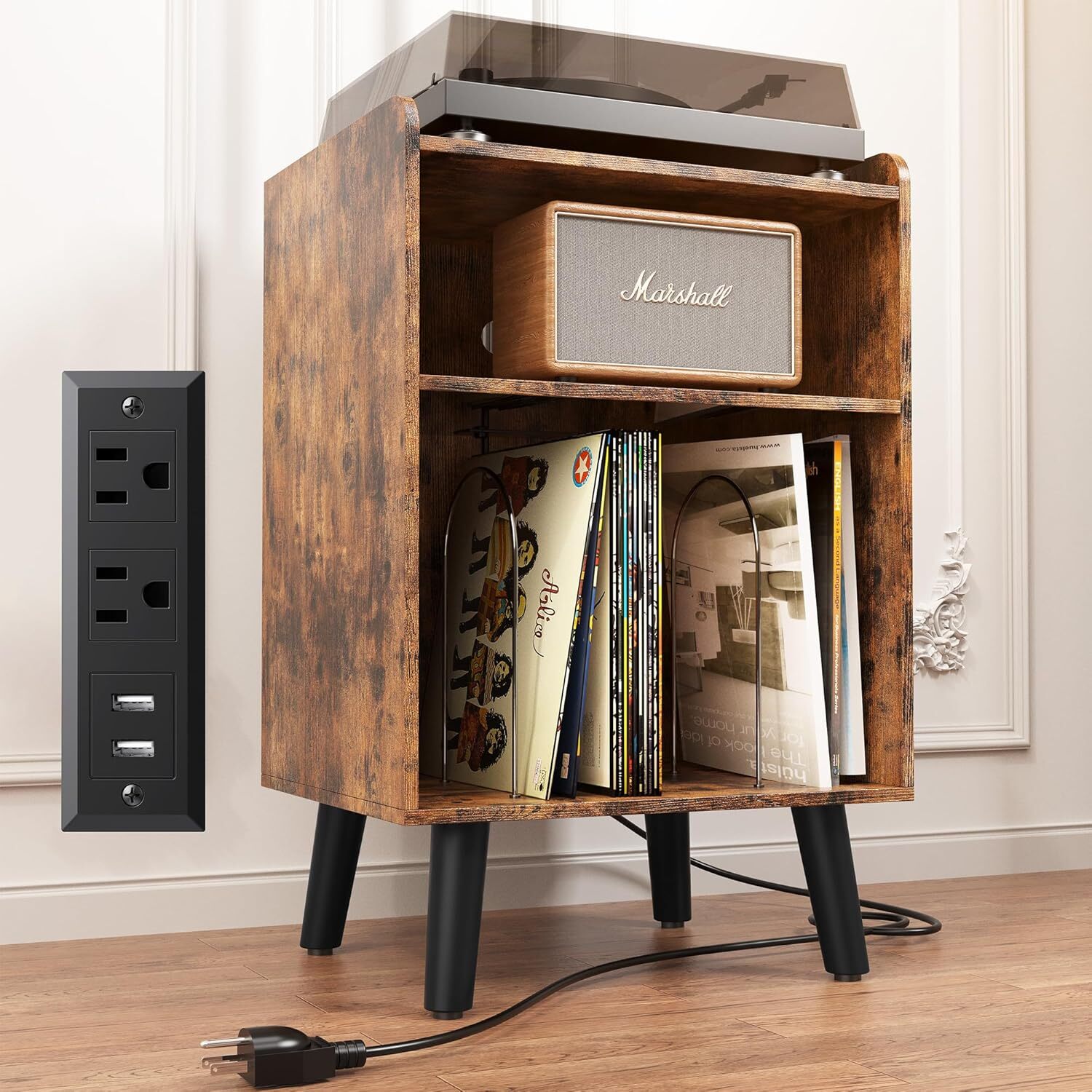 About this item 【Ideal Record Player Stand】Record stand give your living room or entertainment space a retro look . Fit for small than 15.6"-19.7" vinyl record player, This stylish end table has three storage areas. The top layer holds the turntable, the middle layer holds audio accessories, and the bottom divider section holds vinyl records. Perfect for storing vinyl records, albums, magazines, etc. It can be used not only as a vinyl stand , but also as a bedside table,nightstand and side table. 【Sturdy & Decorative Construction】Record player stand with storage is made of laminated MDF and particleboard that will last for years;With the mid-century inspired black metal divider for a fun, retro look. Record player table with solid wood decorative legs, beautiful and solid. The smooth surface can be easily cleaned with just a damp cloth. 【Record stand with Charging Station】Record table equipped with charging station contains 2 AC outlets and 2 USB ports. You can easily charge your cell phone, computer, and other electronic devices on the vinyl record stand .Built-in charging station design is not only convenient for charging, but also makes the side table neat and orderly. 【Portable and Space Saving】Turntable stand allows it to be cleverly installed in any small to medium-sized space, such as by a sofa, in the corner of a room, next to a guitar, etc. This vinyl record player stand only takes up a small space, help you to organize all your vinyl records, albums, CDs, it will be easy to find out what you want to listen.Assembled dimensions: 29.7"H x 19.7"W x 15.7"D. Measurements Item Dimensions 15.7 x 19.7 x 30.2 inches Style Item Shape Rectangular Color Rustic Brown On Feb 8, 2025 at 03:39:20 PST, seller added the following information: