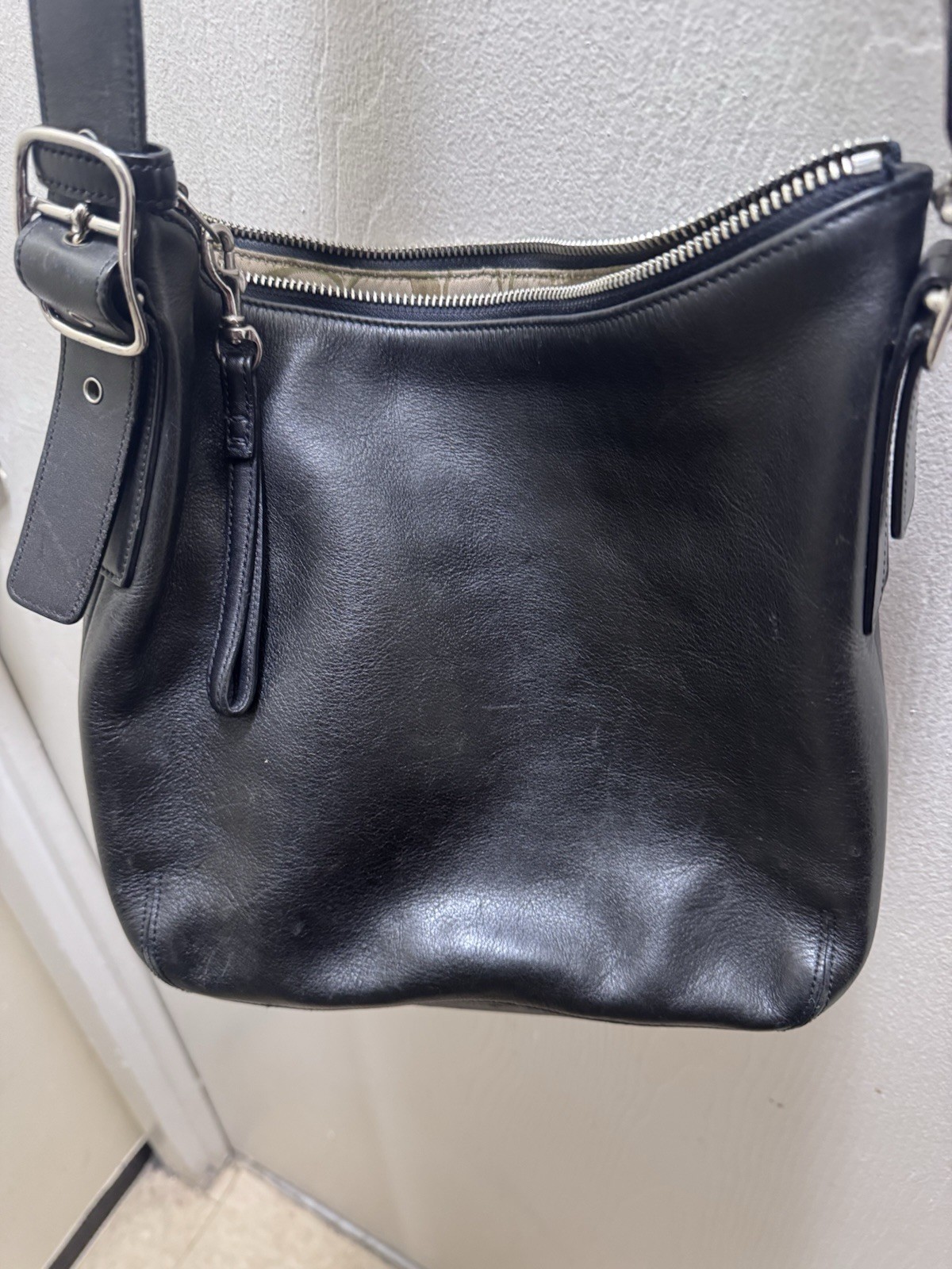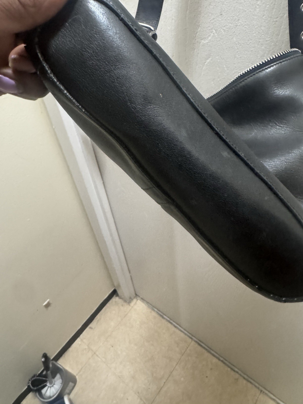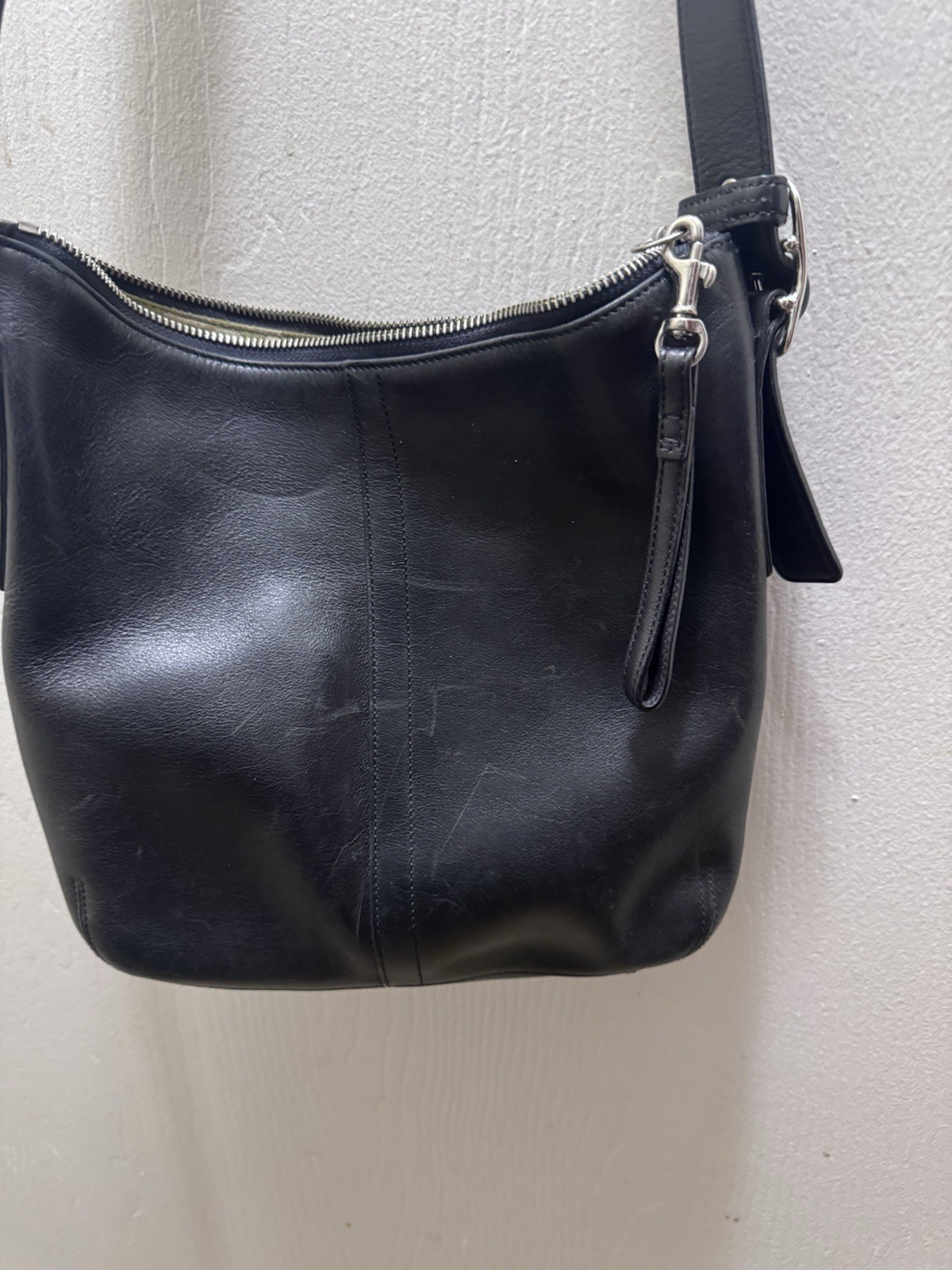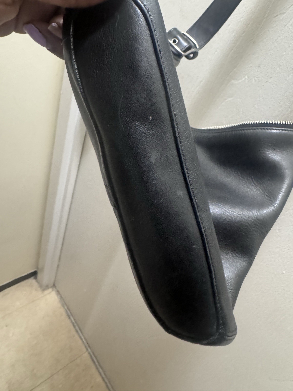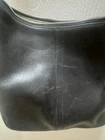 The Vintage COACH black leather Legacy slim hobo shoulder bag is a stylish and versatile accessory for women. This medium-sized rectangular bag features a zip closure and a black leather shoulder strap, making it perfect for various occasions such as travel, parties, casual outings, and business meetings. With silver hardware accents and a buckle detail, this classic and designer bag exudes a timeless elegance. Made in the United States by Coach, this versatile bag with an adjustable strap is a must-have for those looking for a sophisticated and practical handbag.